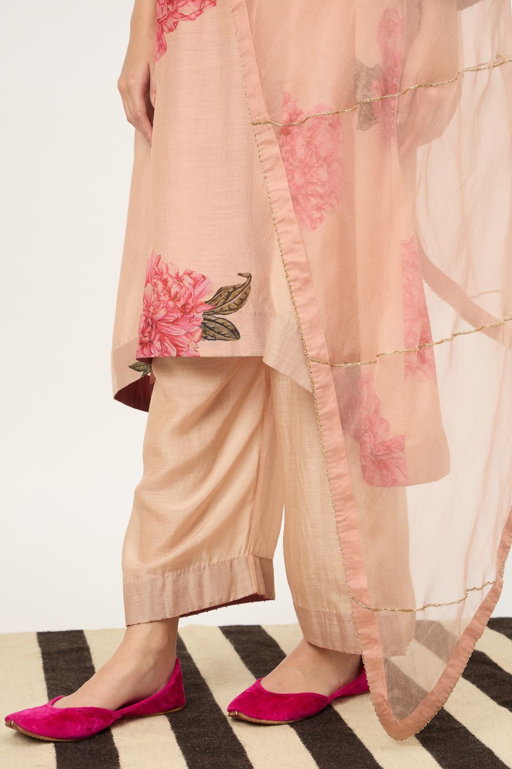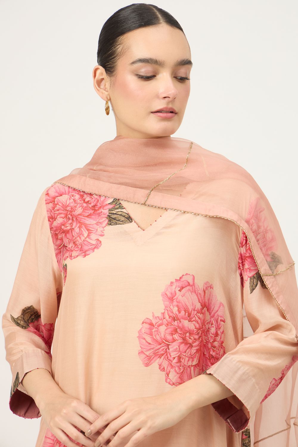 Crafted in a luxurious cotton silk blend, this kurta brings together the softness of cotton with the subtle sheen of silk for an effortlessly refined look. Set on a soothing peach base, the delicate floral prints add a romantic, feminine appeal, making it perfect for both daytime elegance and elevated casual wear.