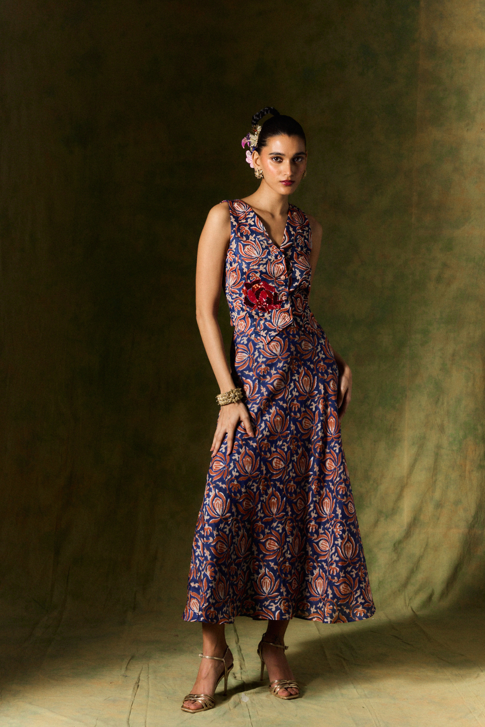 Hand block–printed textiles become canvases of unexpected geometry; colours flirt and converse rather than simply match; silhouettes carry an ease that mirrors the modern woman’s rhythm. There is a certain audacity to their aesthetic — not loud, but liberated. Not trendy, but timeless in its cultural fidelity.