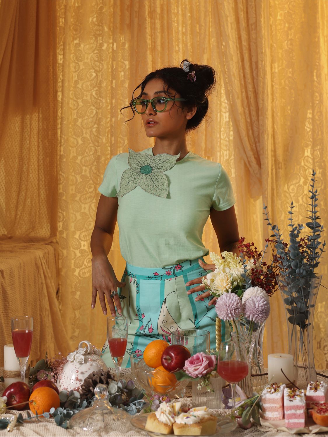 This standout mini skirt is paired with a mint knit T-shirt adorned