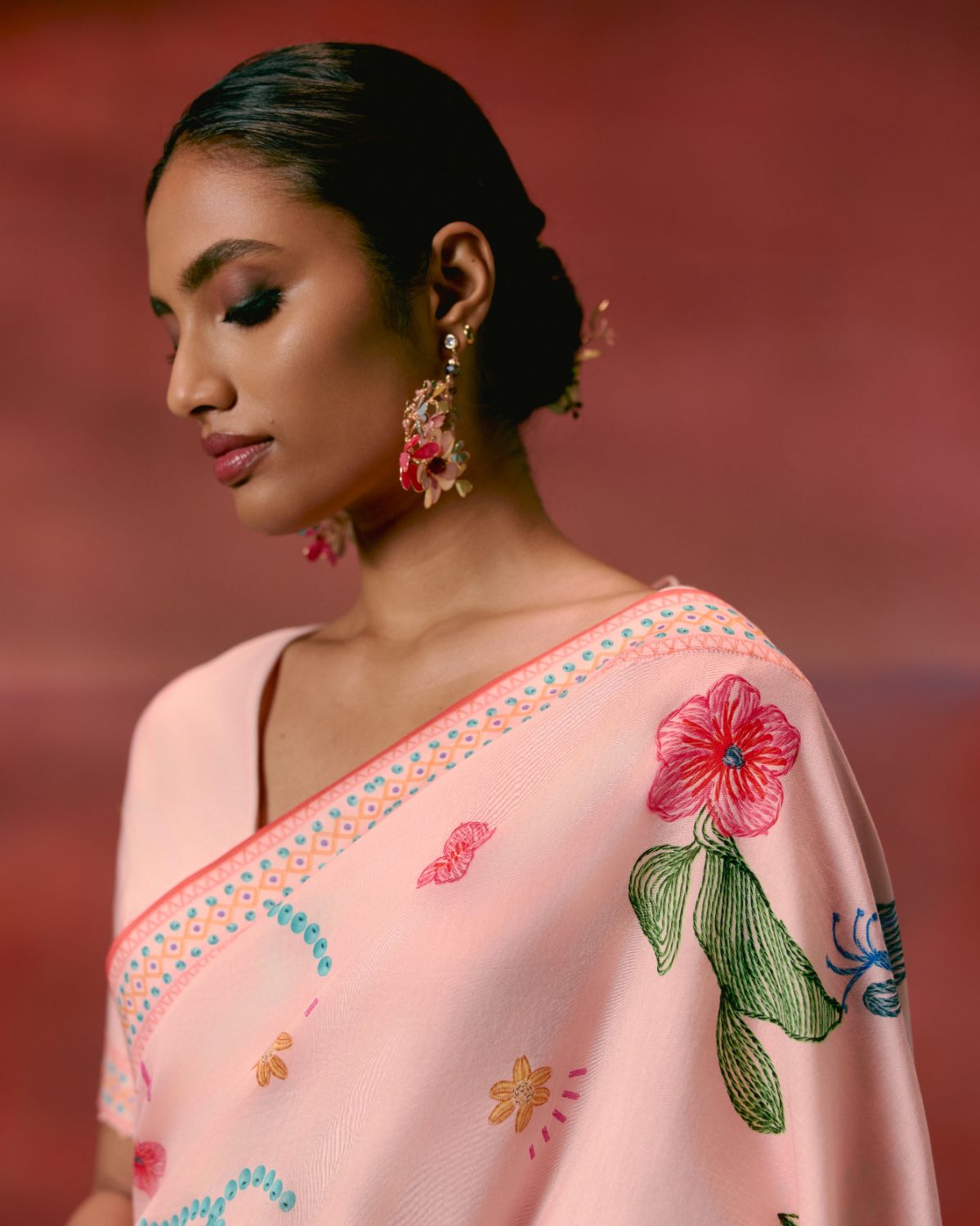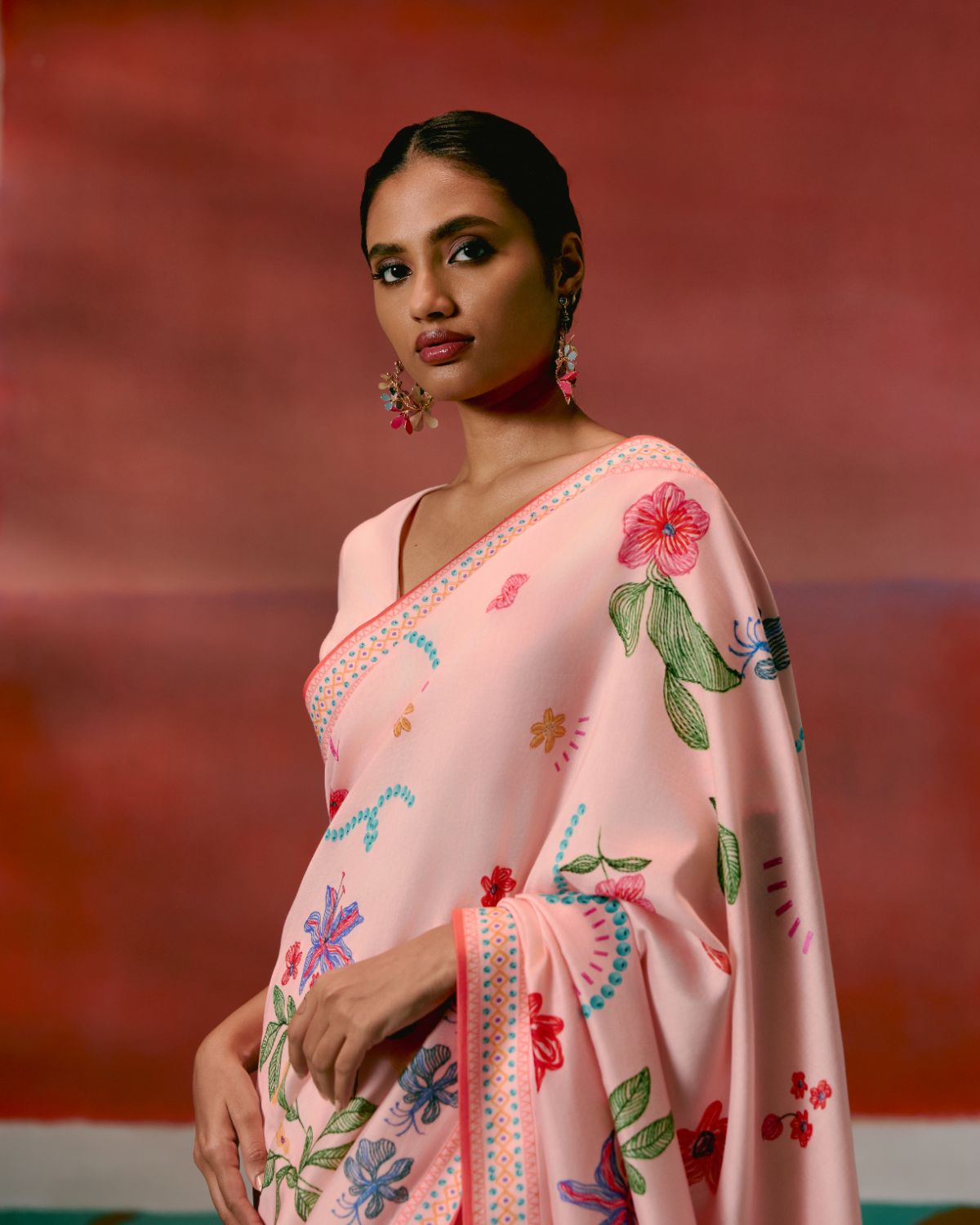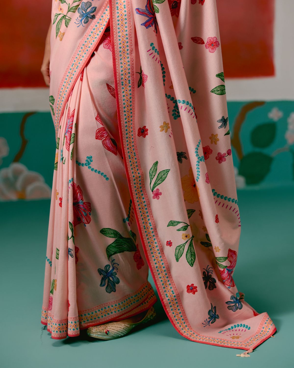 Soft and romantic, this saree is designed on a dusty pink base with painterly floral motifs that exude feminine charm. The pallu is accented with handcrafted beaded tassels, adding just the right hint of sparkle to this elegant piece.