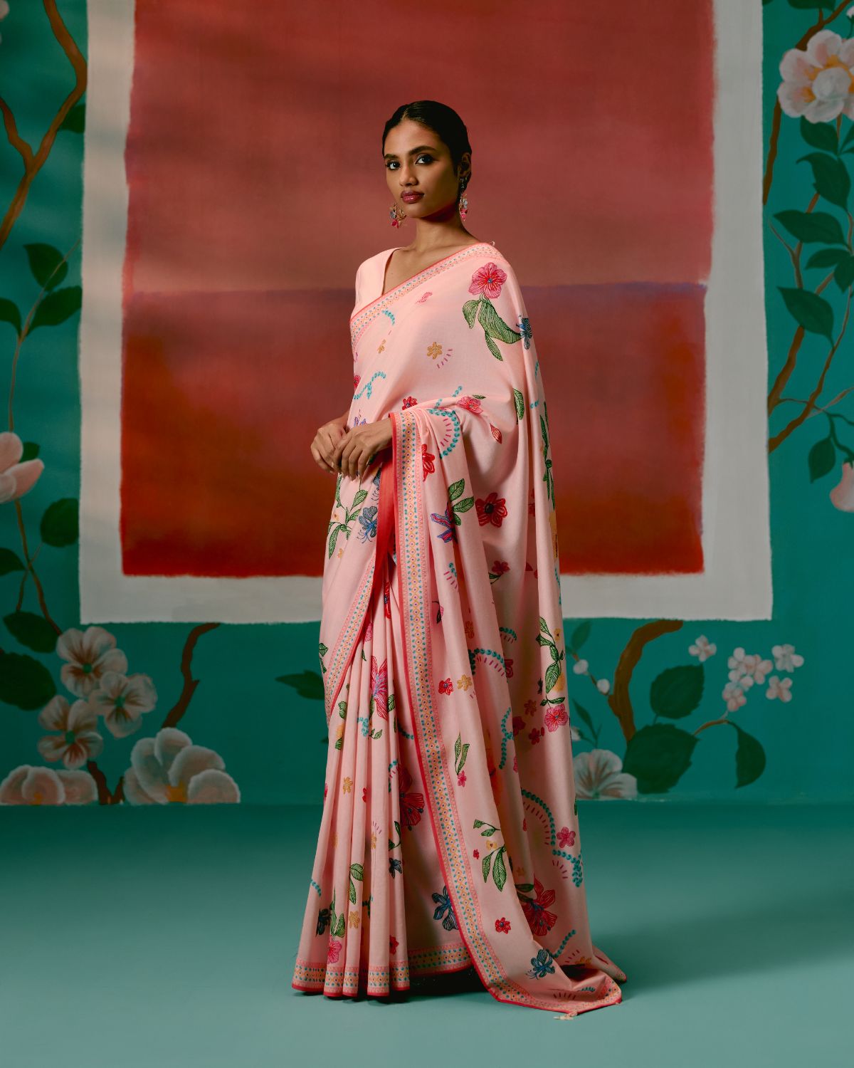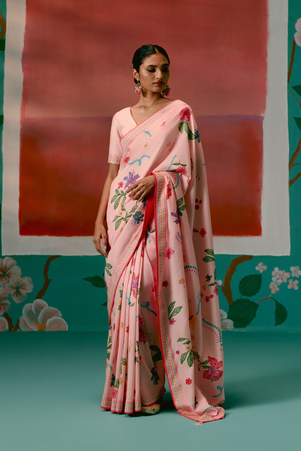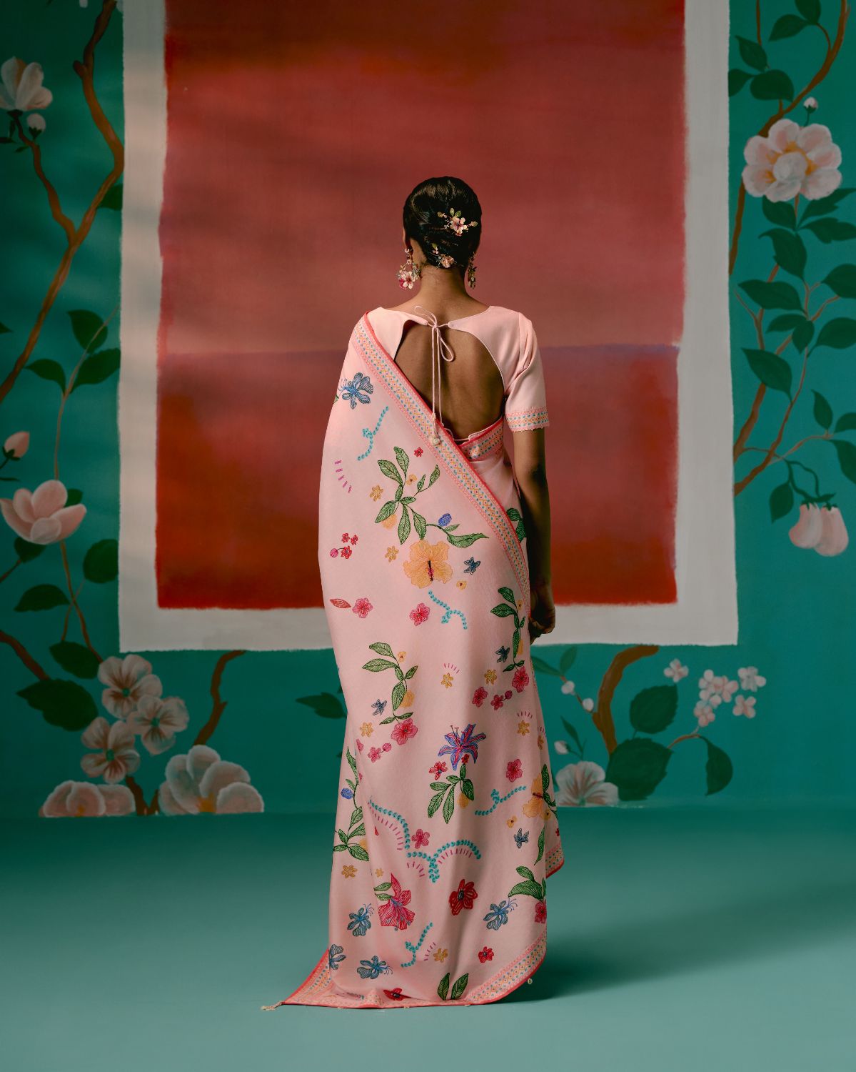 Soft and romantic, this saree is designed on a dusty pink base with painterly floral motifs that exude feminine charm. The pallu is accented with handcrafted beaded tassels, adding just the right hint of sparkle to this elegant piece.