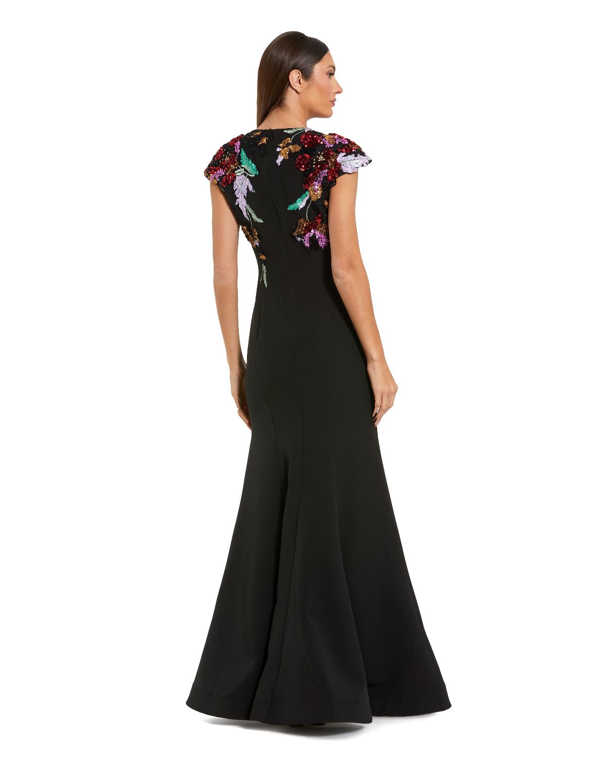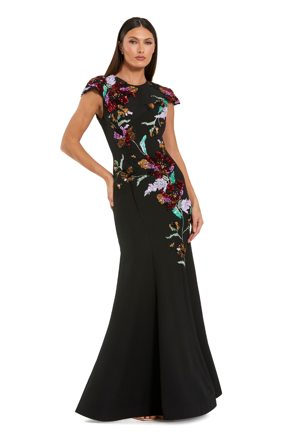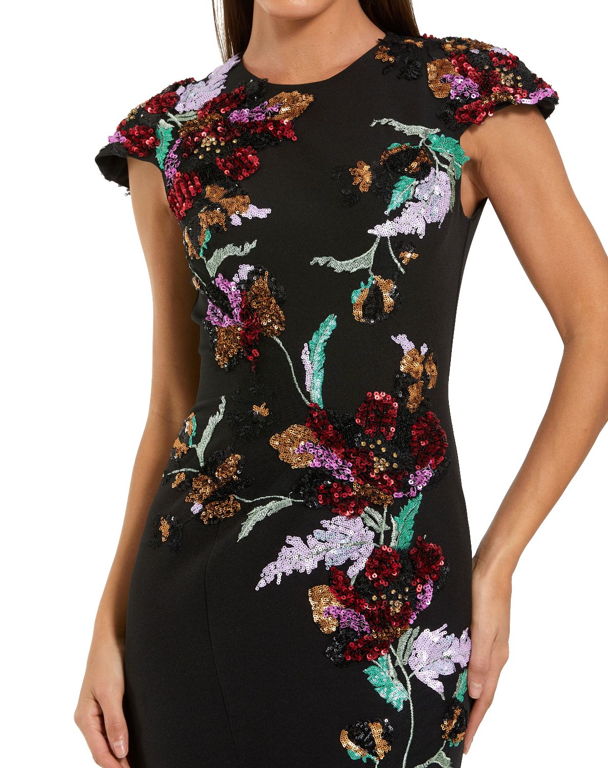 Multicolored sequin floral embroidery adorns the bodice and skirt