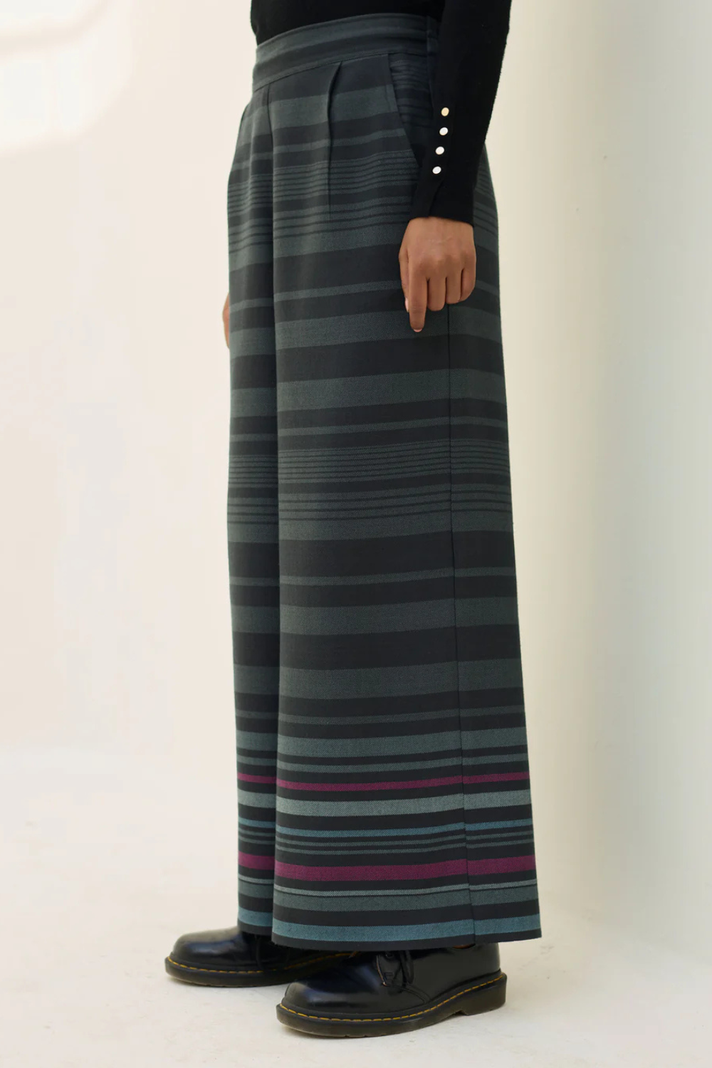 This Vola pants are designed in our yarn-dyed merino wool woven as a two toned check with a vibrant multi-coloured striped border. Designed for comfort and functionality, the culottes include a back elasticated waistband with an inside drawstring for an adjustable fit, as well as comfortable wool-lined pockets.