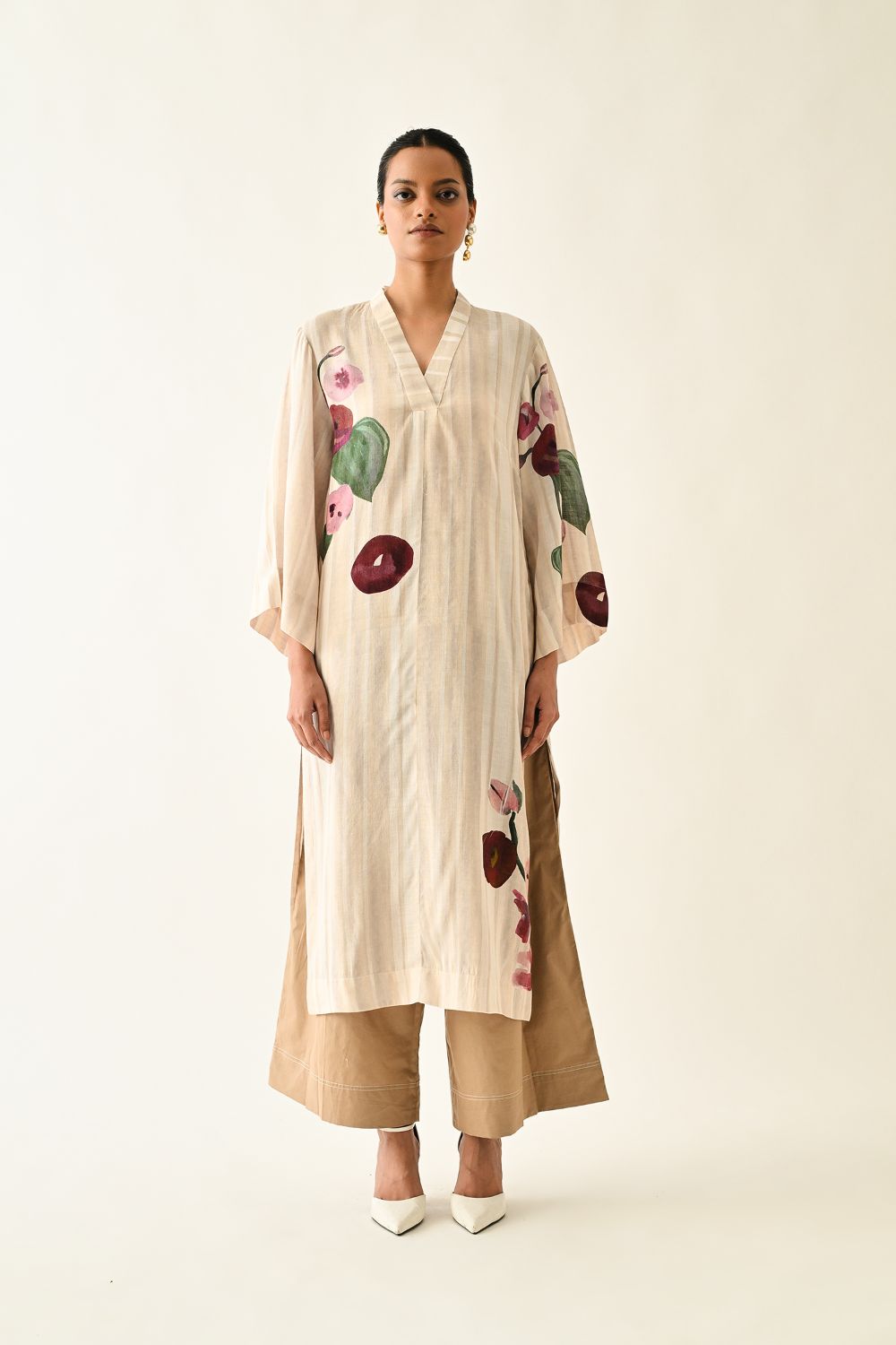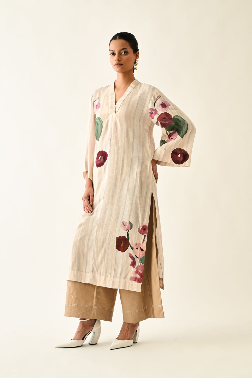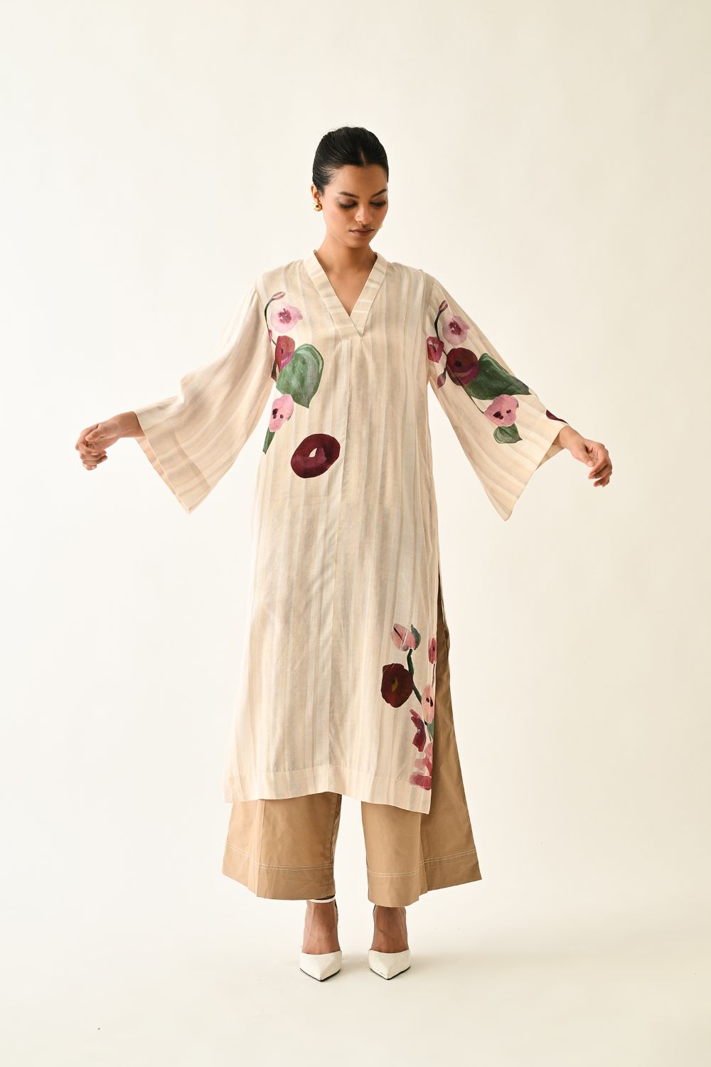 Tunic: Anti-Fit, Hand-painted abstract expressionist digitally transferred print, V-neck kurta, Side pocket. Print placements will vary—single Piece. Model is wearing XS/S