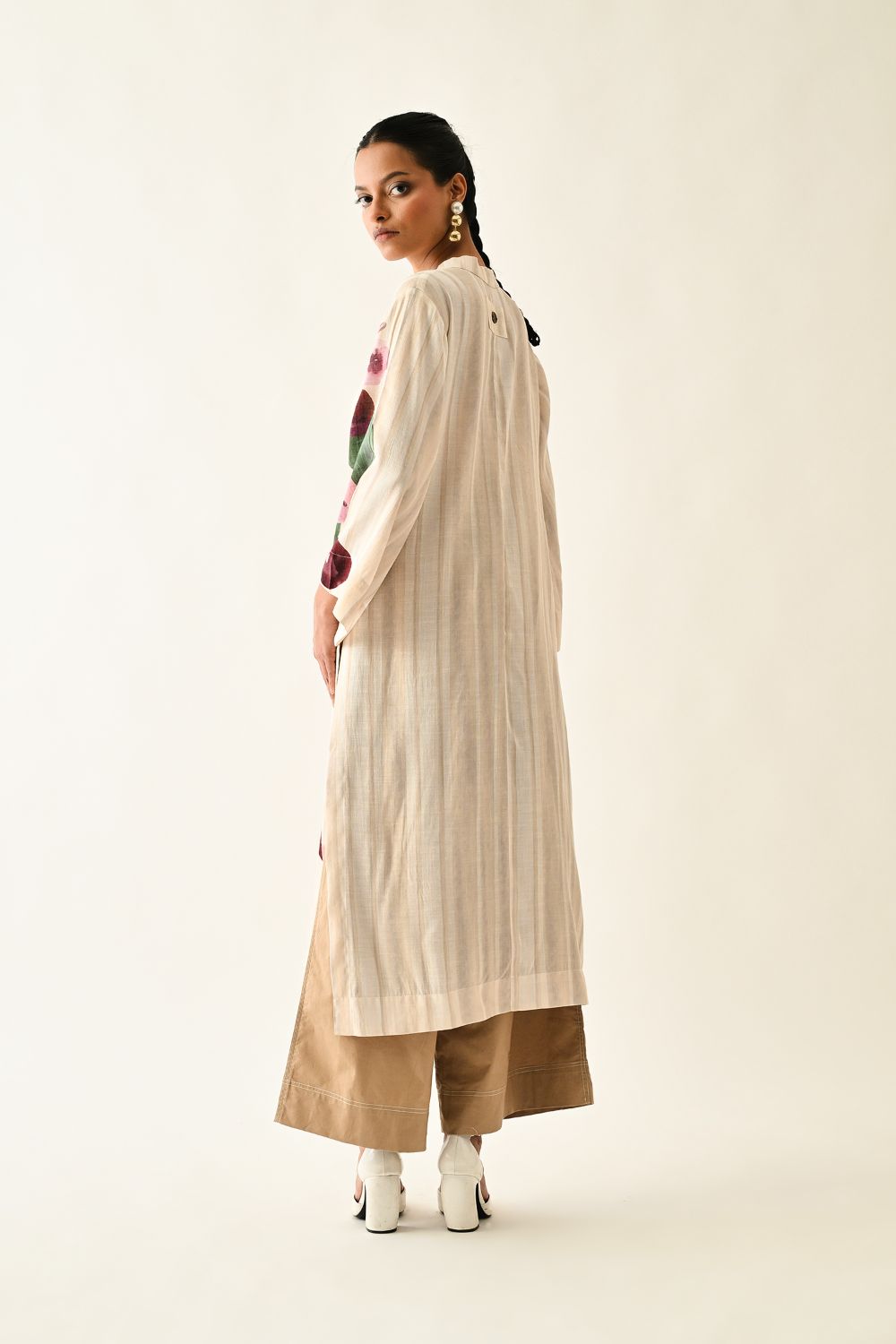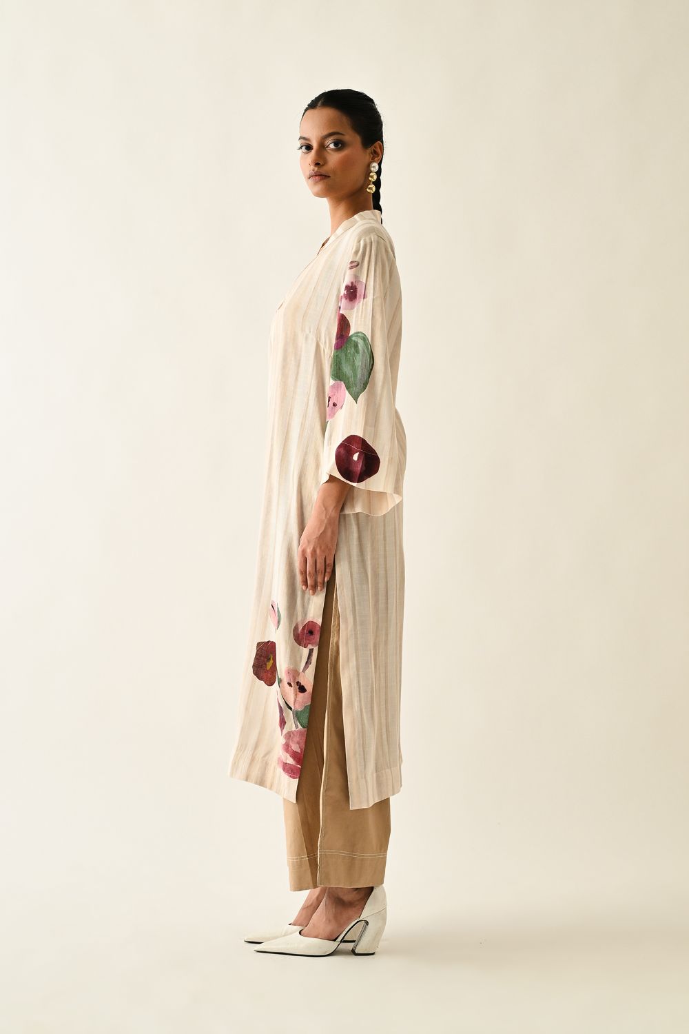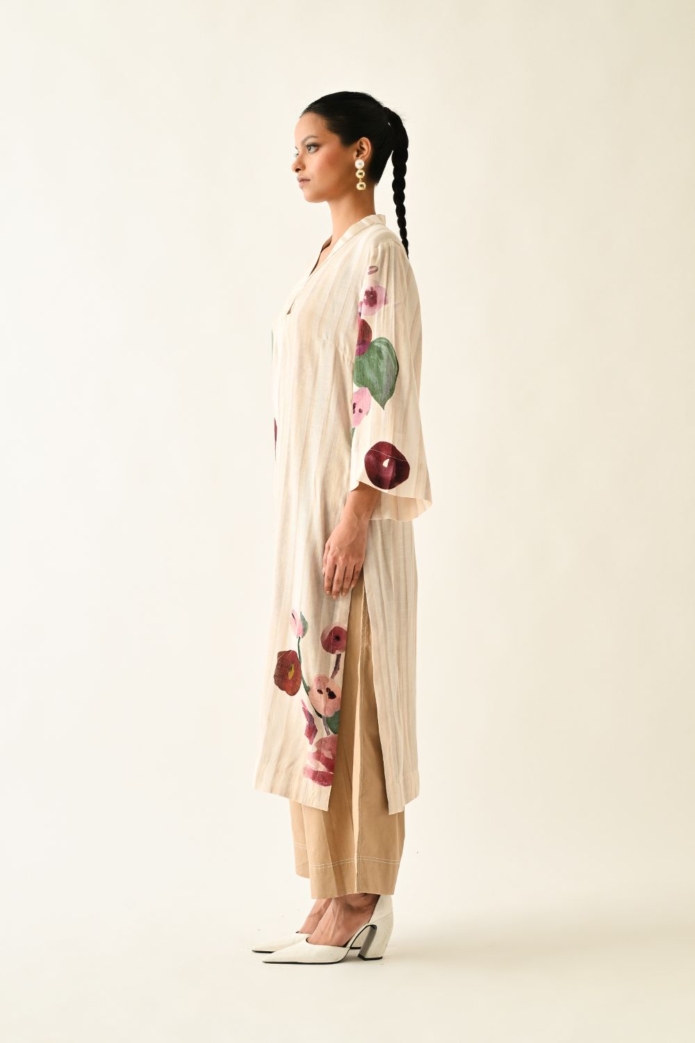 Tunic: Anti-Fit, Hand-painted abstract expressionist digitally transferred print, V-neck kurta, Side pocket. Print placements will vary—single Piece. Model is wearing XS/S