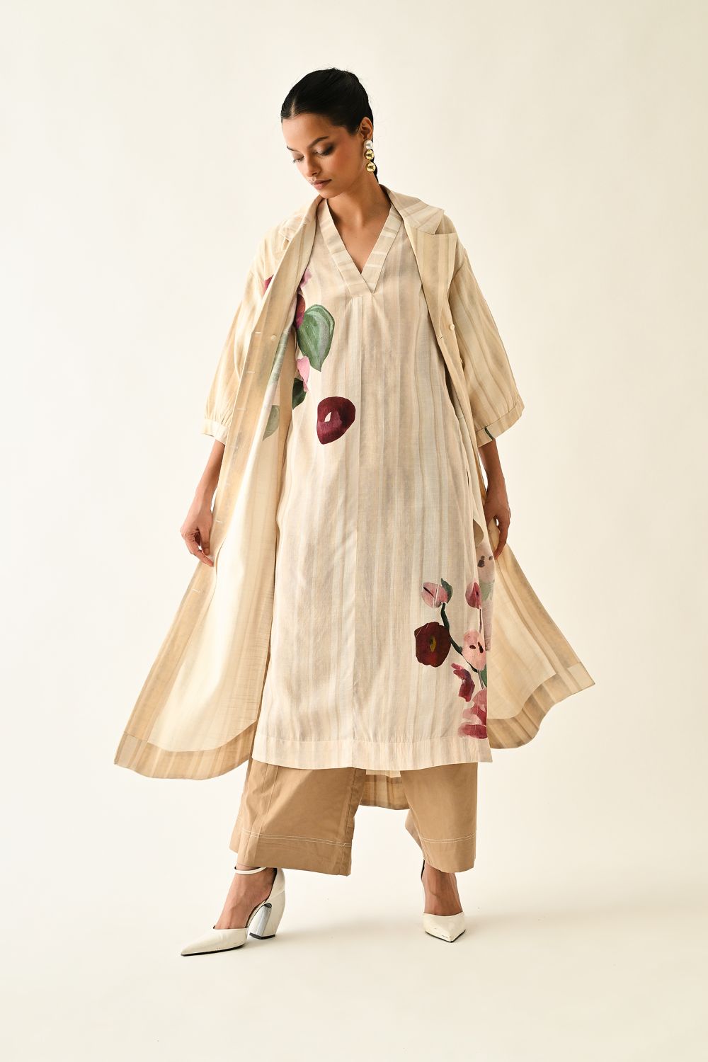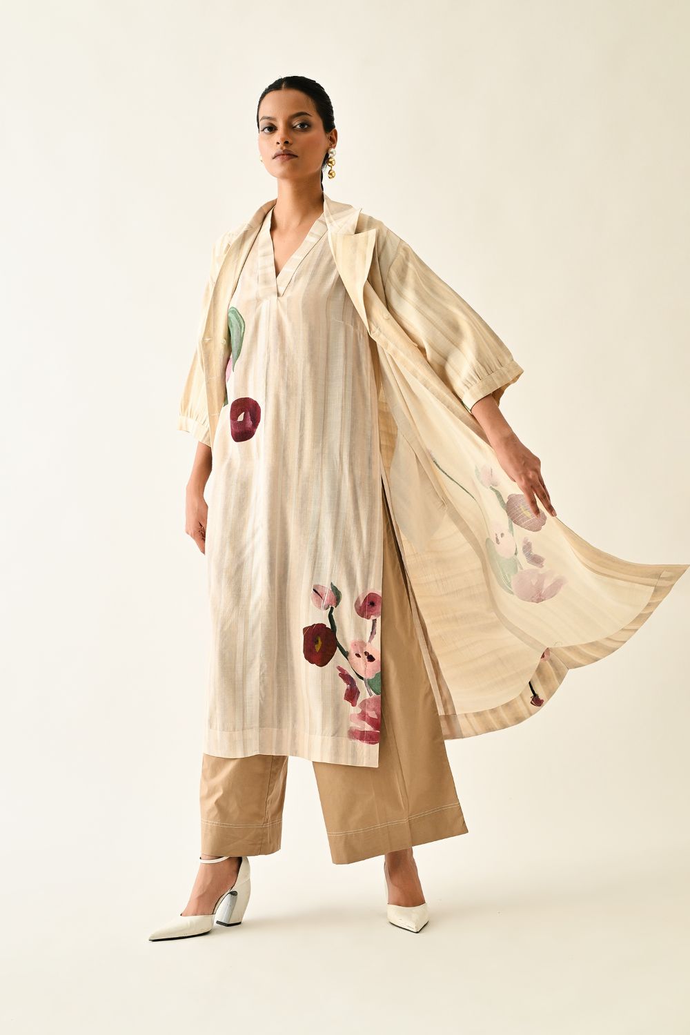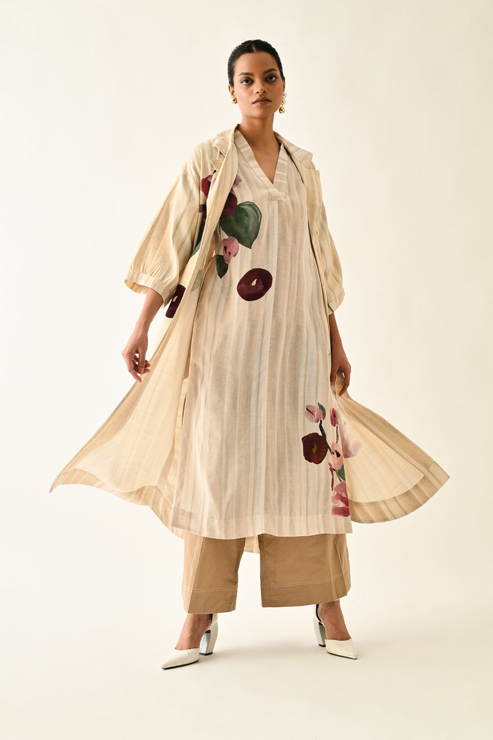 Tunic: Anti-Fit, Hand-painted abstract expressionist digitally transferred print, V-neck kurta, Side pocket. Print placements will vary—single Piece. Model is wearing XS/S
