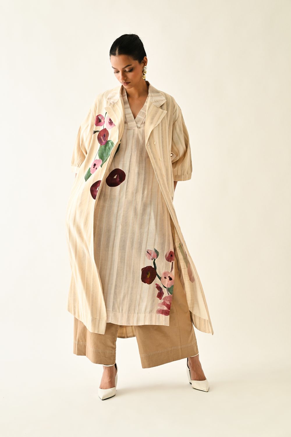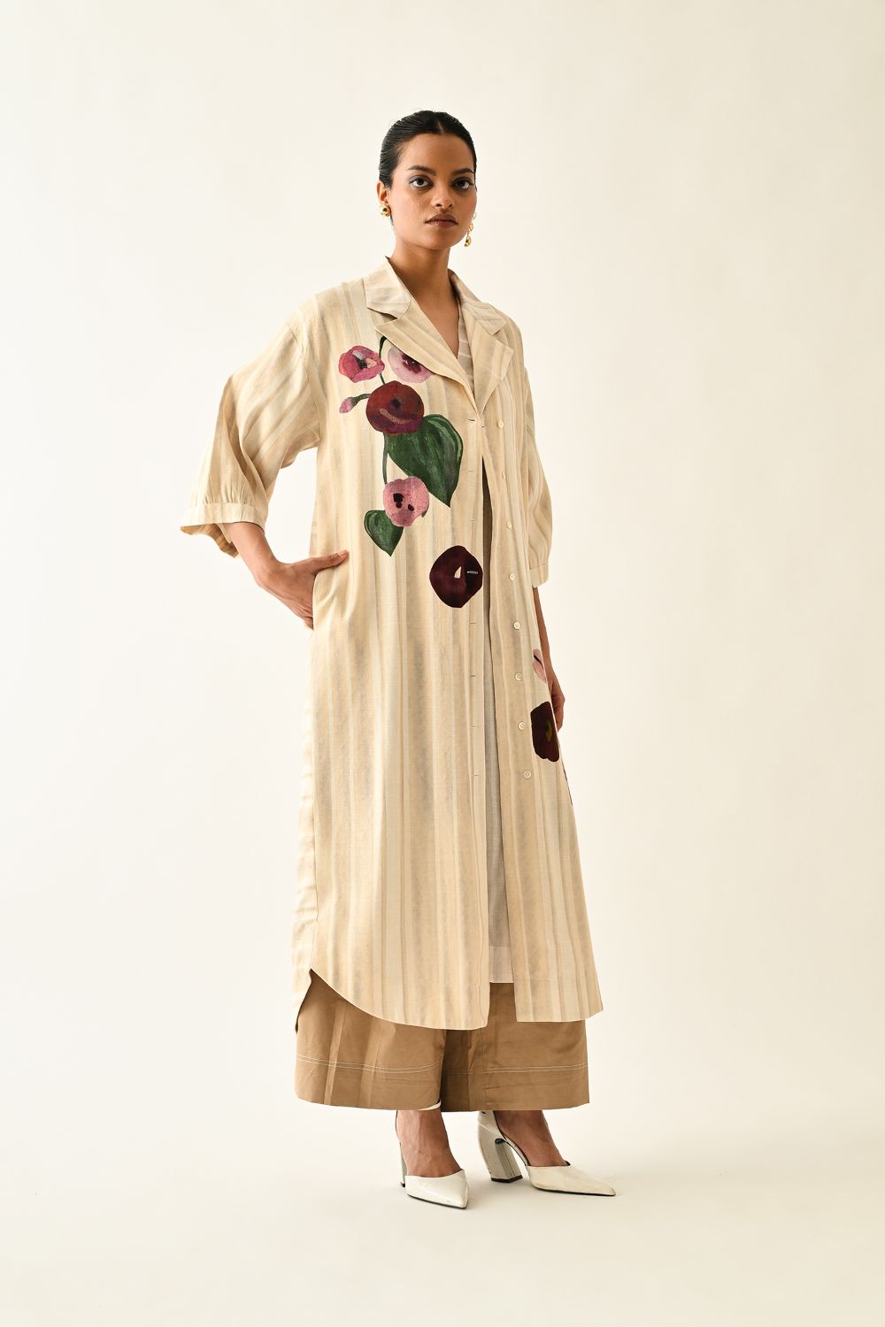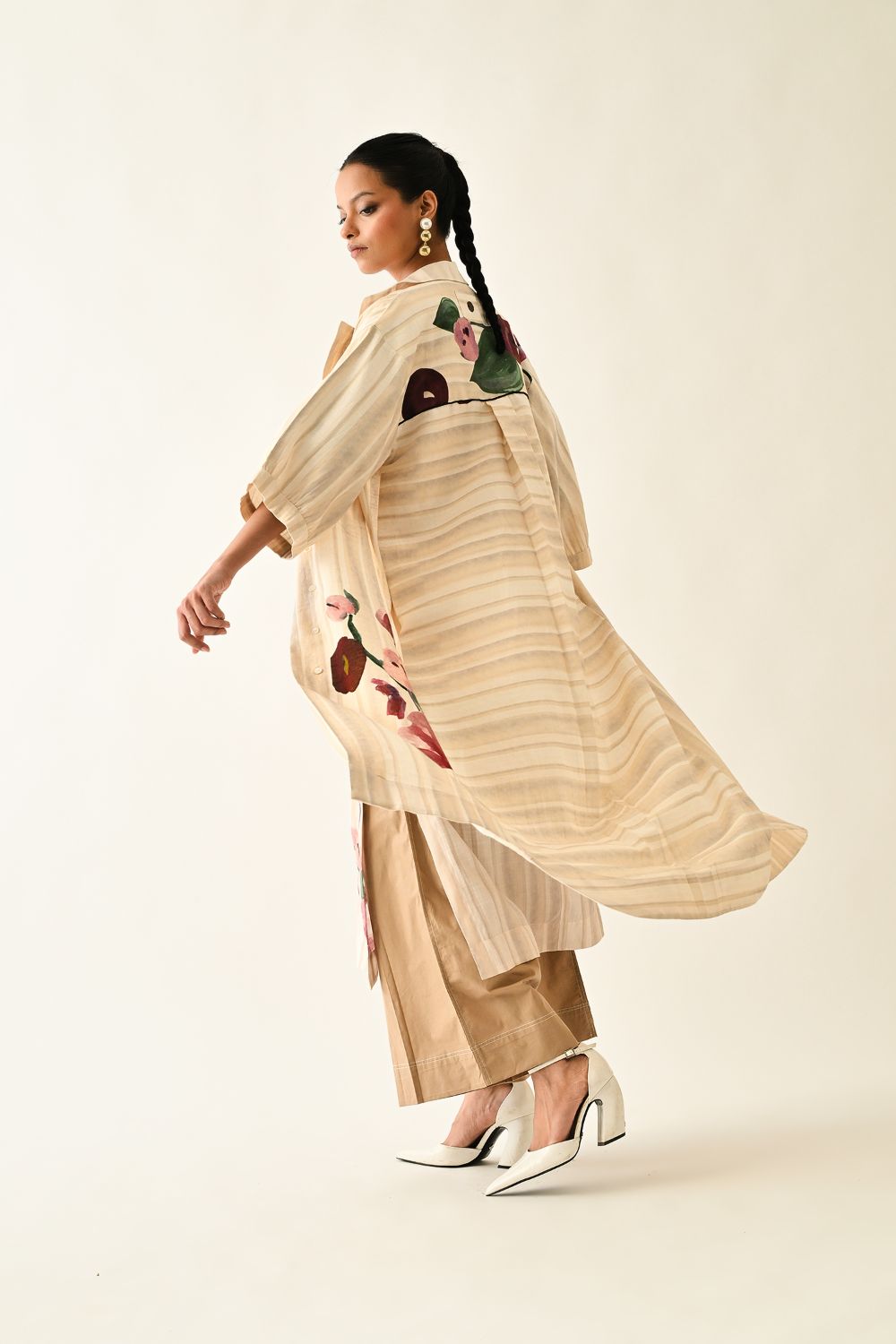 Overlay: An Anti fit trench with Hand-painted abstract expressionist digitally transferred print, gathered sleeves, back yoke, box pleat at the back. Print placement will vary - single piece. Model is wearing - XS/S