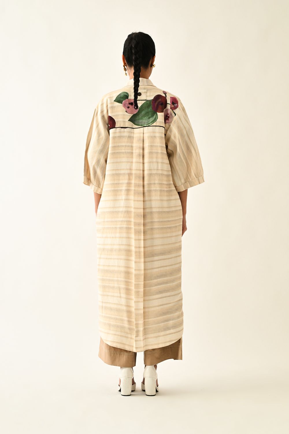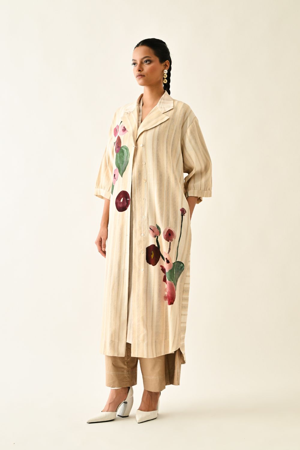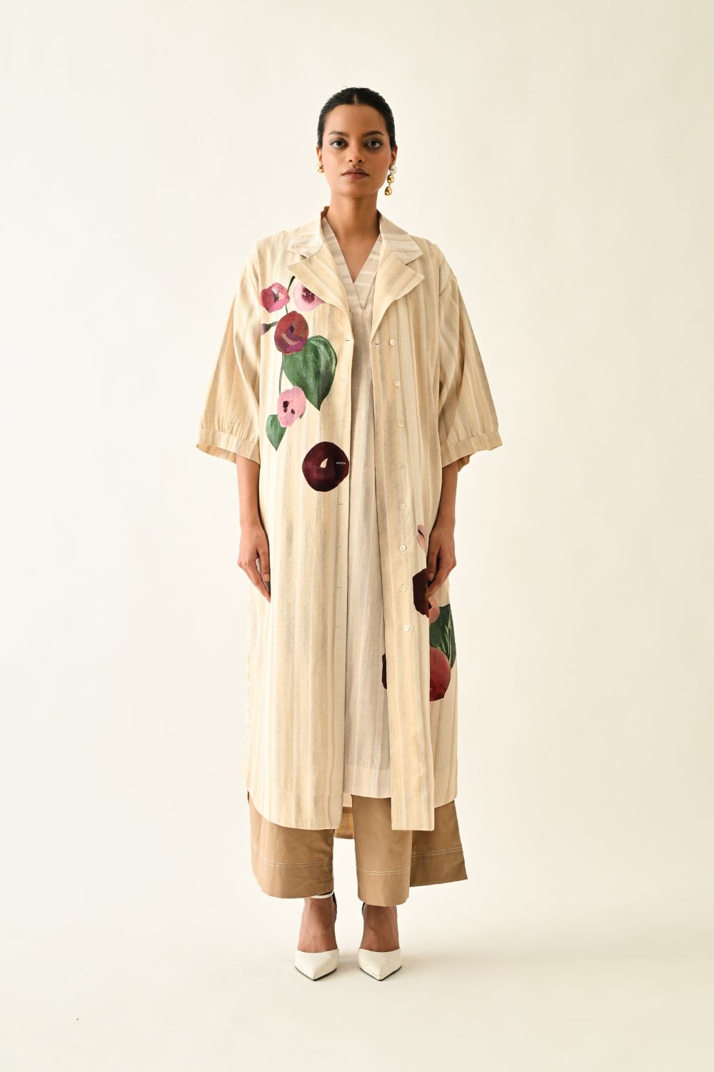Overlay: An Anti fit trench with Hand-painted abstract expressionist digitally transferred print, gathered sleeves, back yoke, box pleat at the back. Print placement will vary - single piece. Model is wearing - XS/S