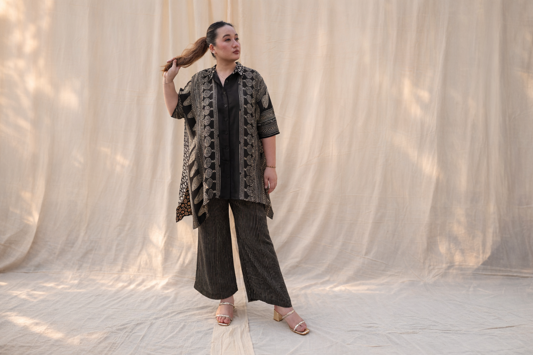 A designer-favorite silhouette,so comfortable she truly lives in it. This breezy loose-fit button-down top features traditional Ajrakh motifs in black organic tones, paired with matching striped Ajrakh pants for a cohesive, relaxed, and effortlessly stylish ensemble. The shirt seamlessly transitions from office wear to after-office occasions while carrying a strong sustainability narrative. Model height is 5'5" and is wearing a size L–XL.