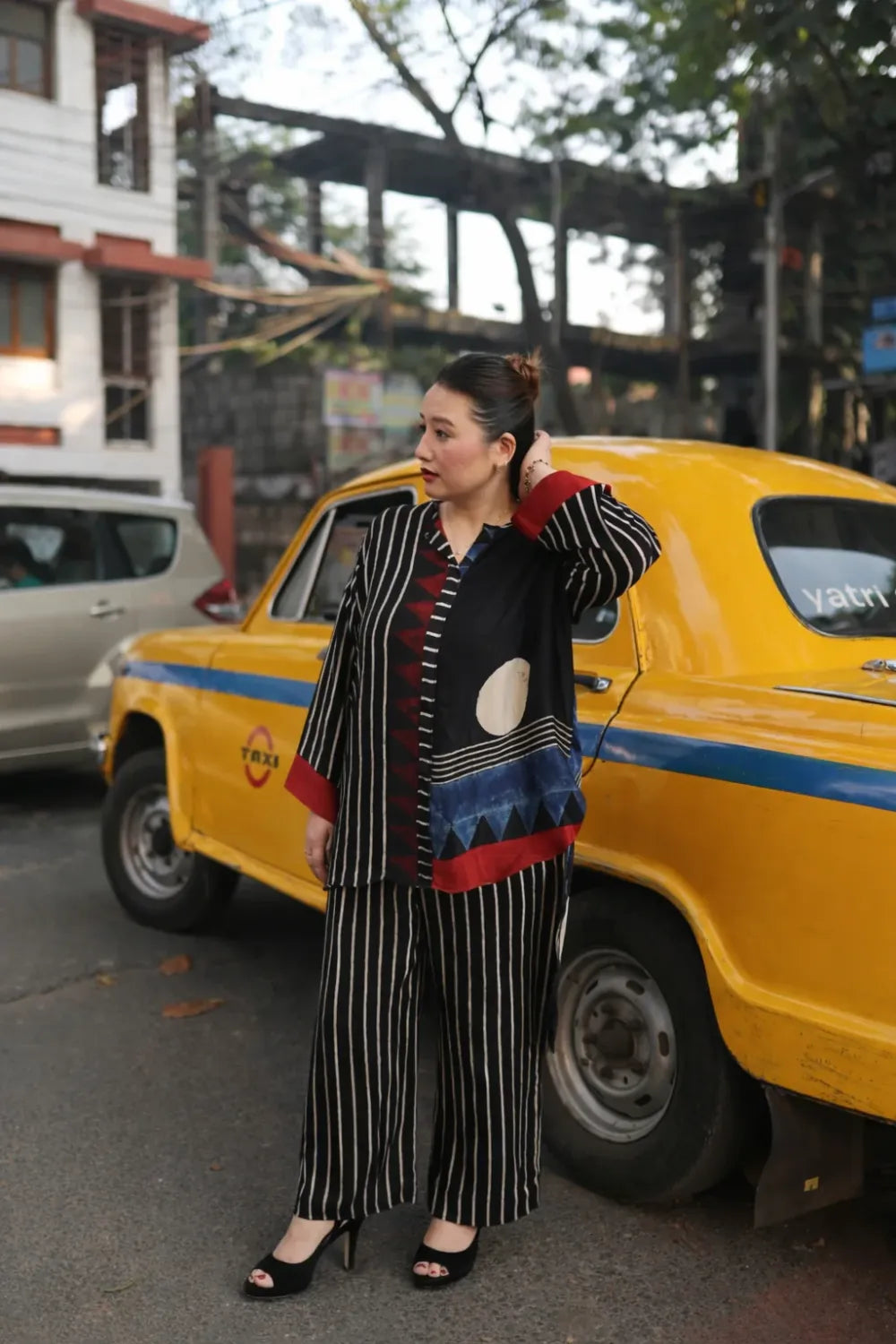 A statement co-ord set featuring bold vertical stripes and geometric patterns in black, highlighted with accents of red, white, and blue. The hi-low relaxed shirt is designed for everyday social and professional commitments, seamlessly transitioning from office wear to after-office style while embodying a sustainable ethos. Model height is 5'5" and is wearing a size L.
