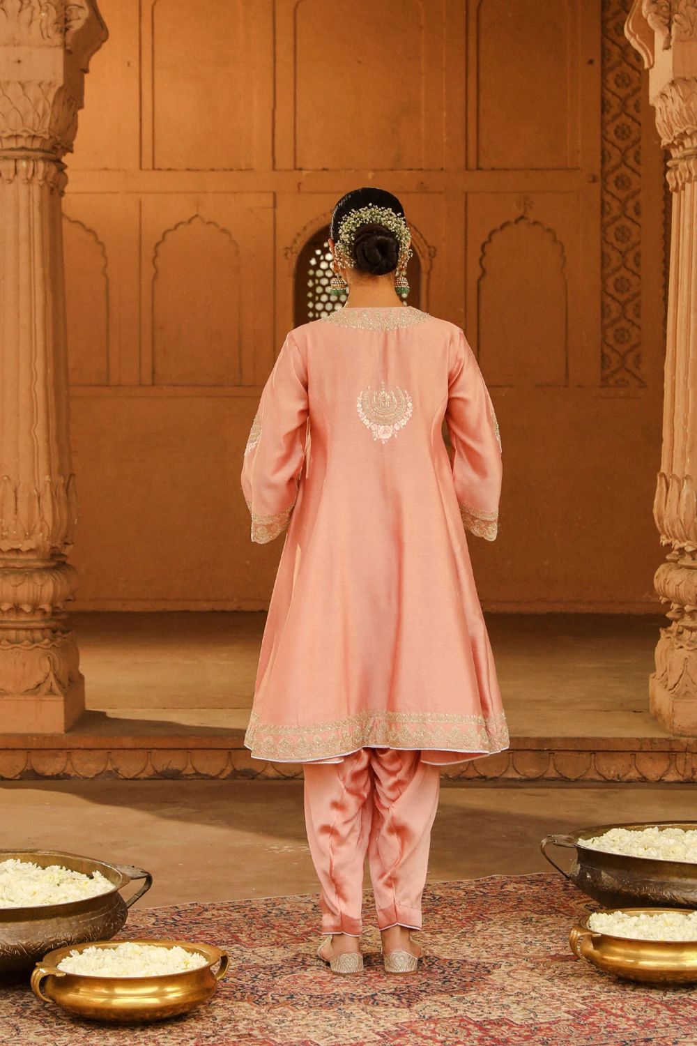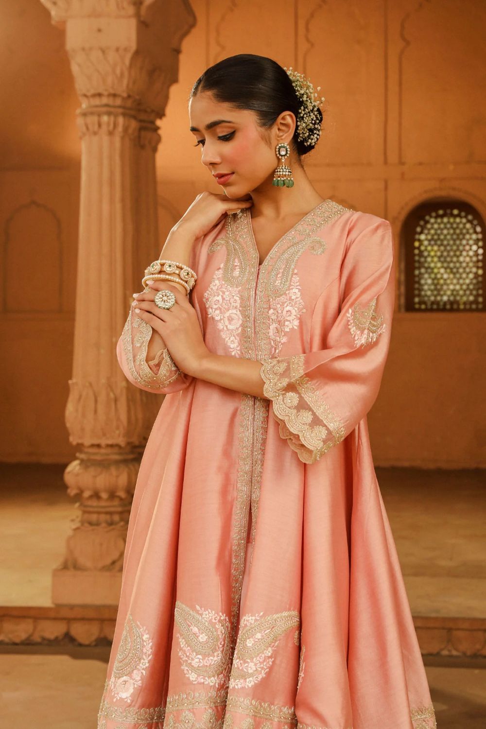 The short kalidaar Faria ensemble is made in pure silk chanderi fabric teamed up with a dogri salwar and a silk organza dupatta. The outfit is having a V neck, front open and three-quarter sleeves. The outfit is adorned with Kashmiri tilla and parsi gara embroidery highlighted with basra moti. The outfit is finished with scallop detailing.