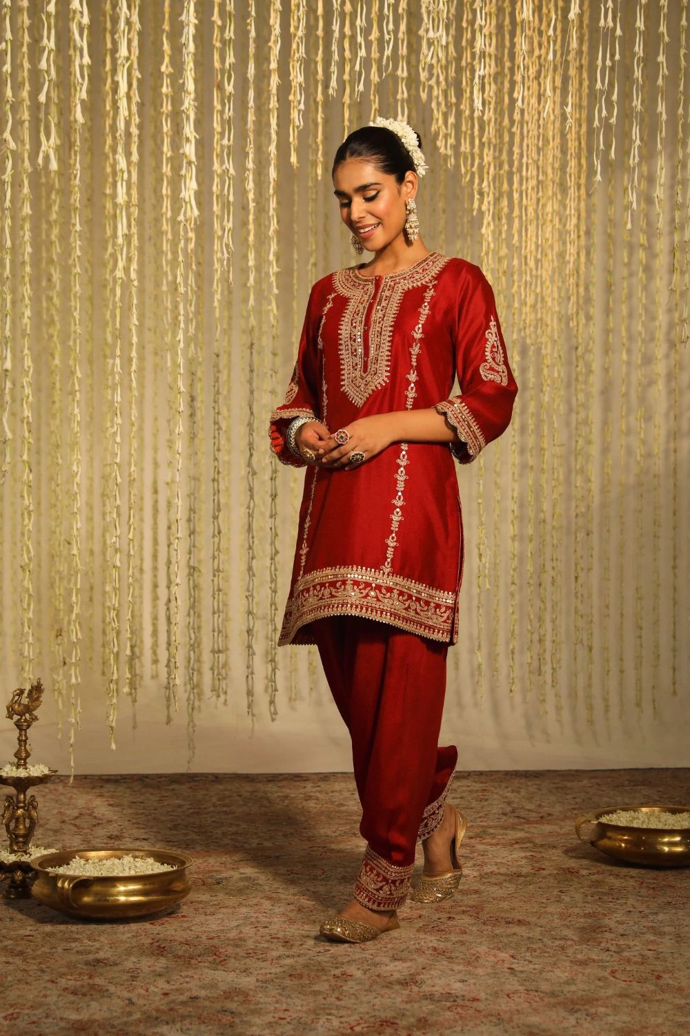 Each garment carries her signature balance — delicate motifs, fluid silhouettes, and a fit that feels custom even before tailoring begins. Her embroideries are intricate yet airy, expressive yet elegantly understated.
