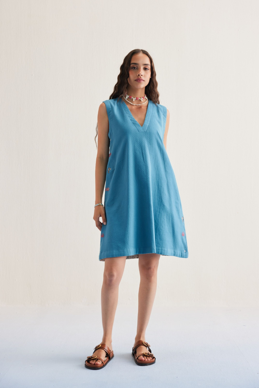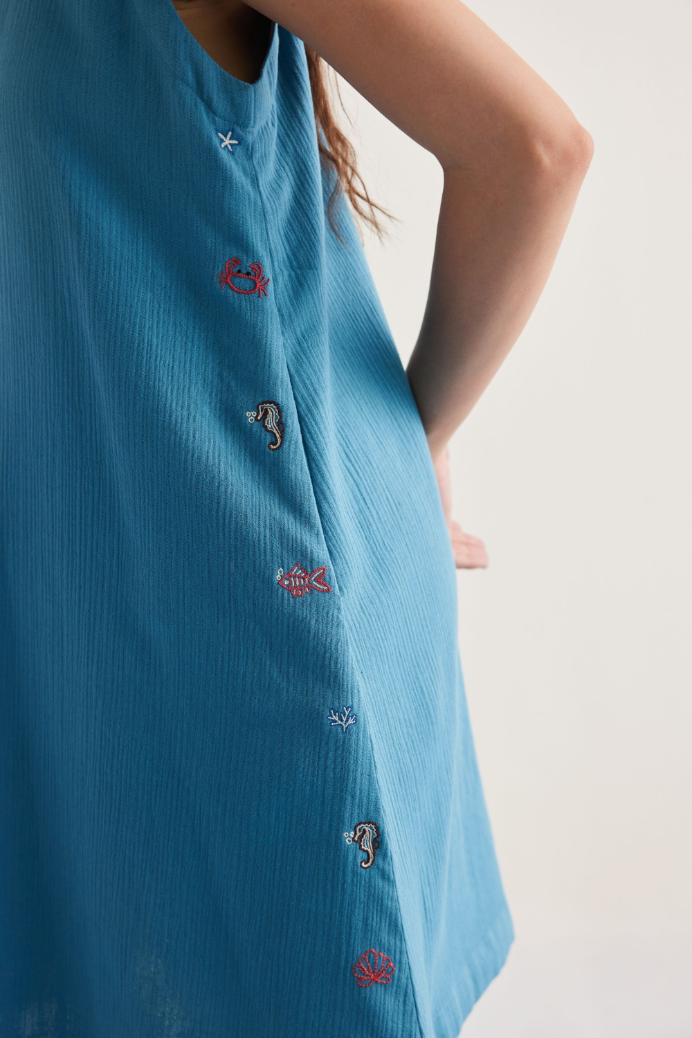 Relaxed fit, sleeveless, v-neck, mini dress crafted in azo-free dyed double gauze organic cotton fabric, hand embroidered with ocean life inspired motifs.