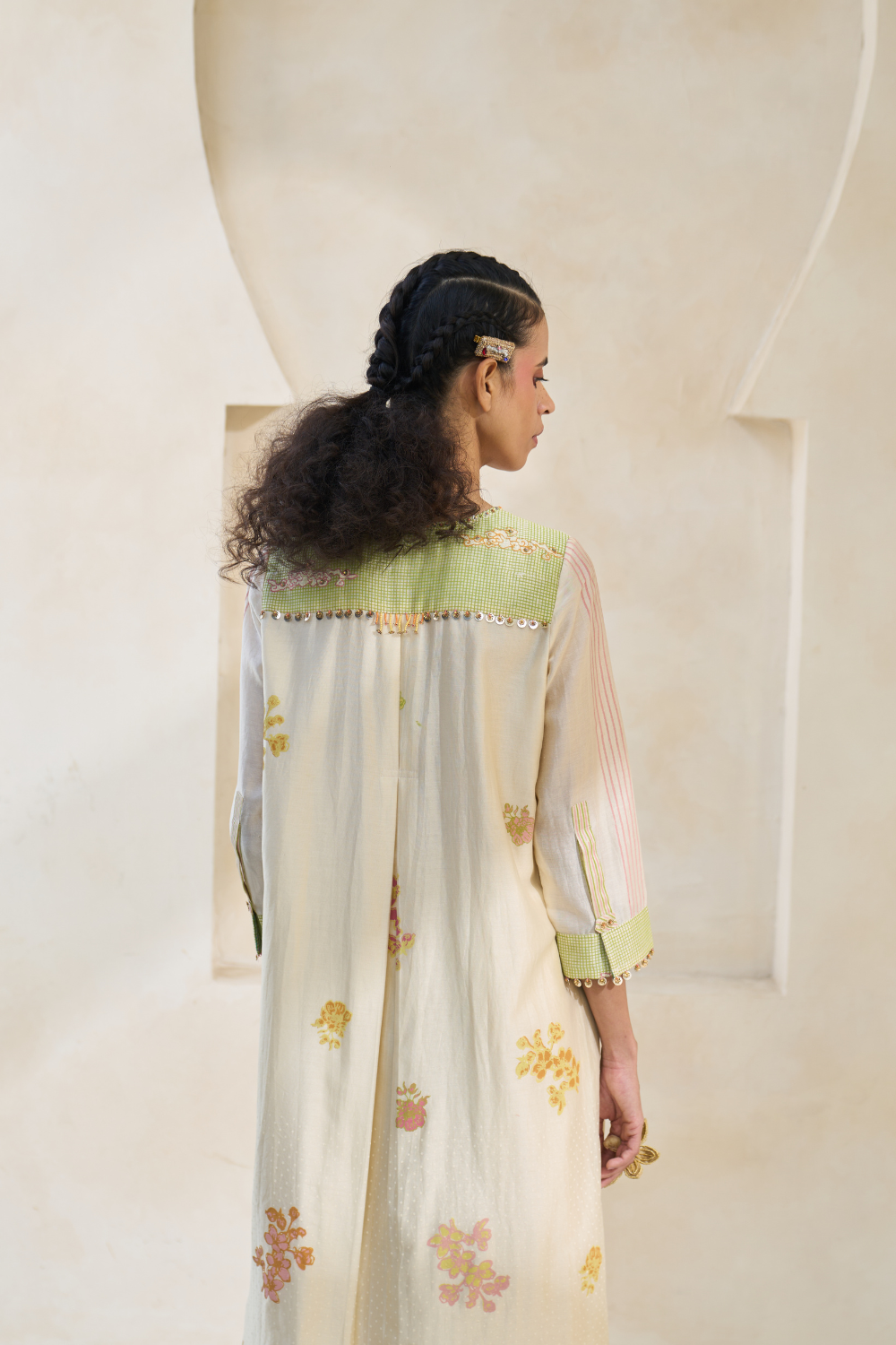 High-low kurta hand block print embellished with hand-done beading, in handwoven 60 gm Chanderi with 100% cotton lining.