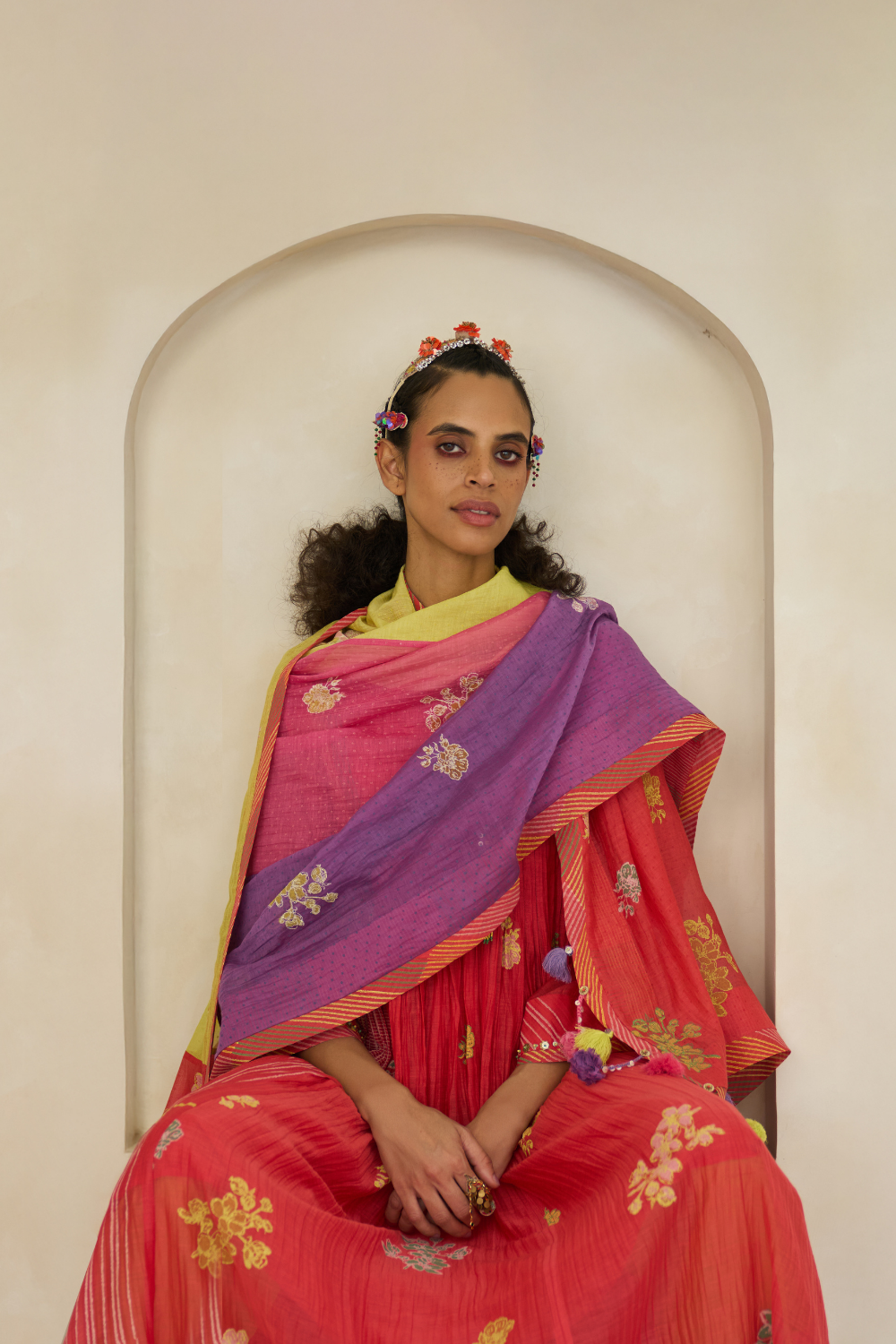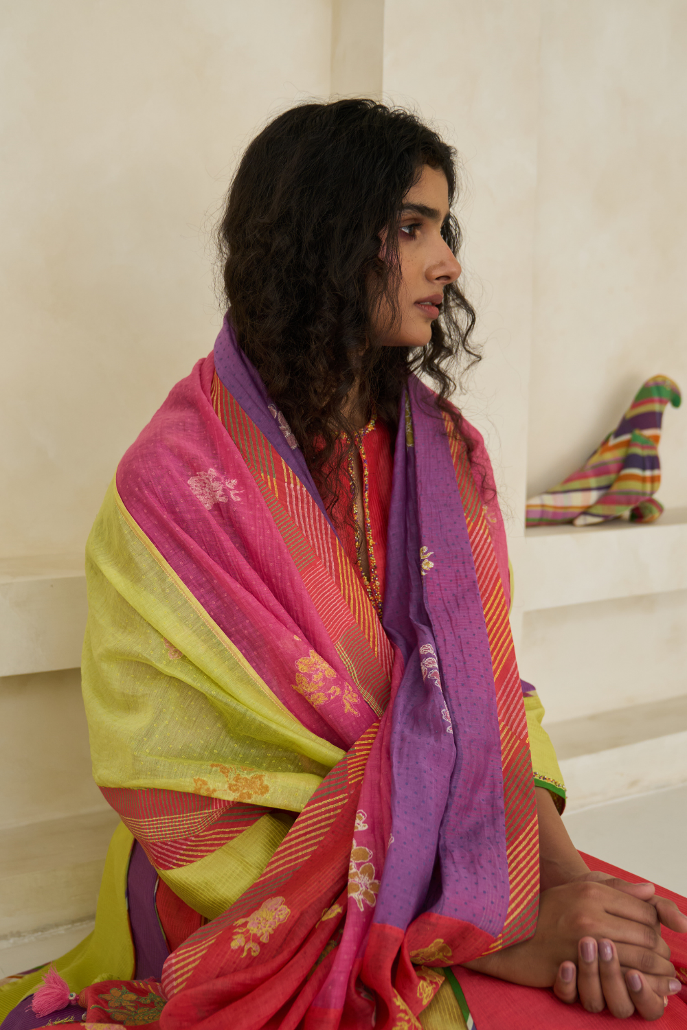 Her Chanderi carries its signature translucence and soft sheen, but with a subtlety that feels almost ethereal — printed slowly, consciously, through hand block printing that heightens the fabric's inherent delicacy.