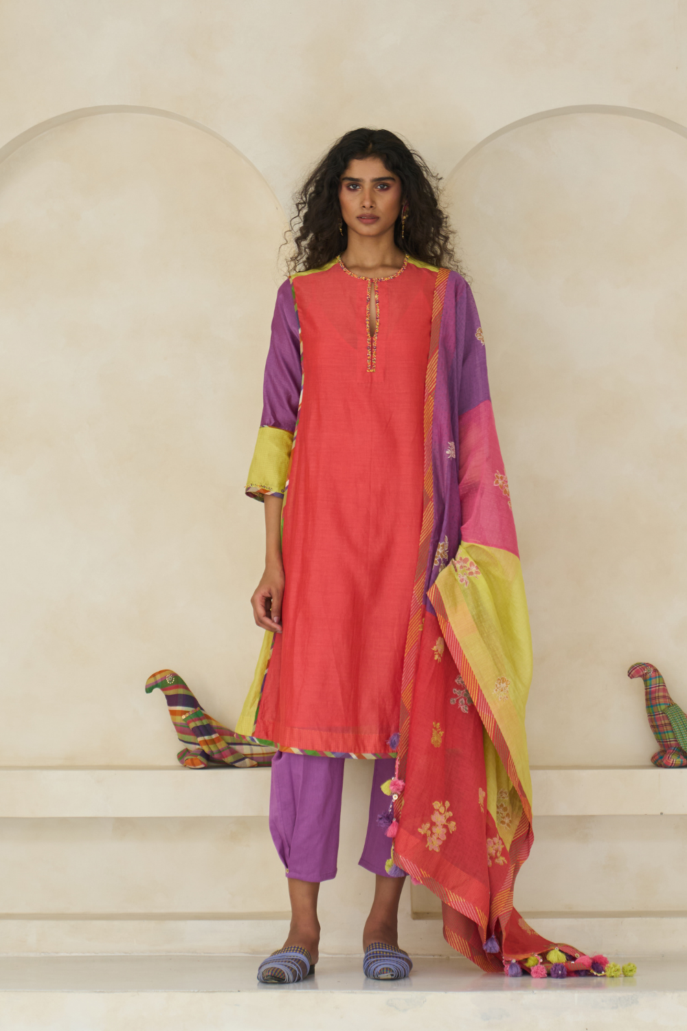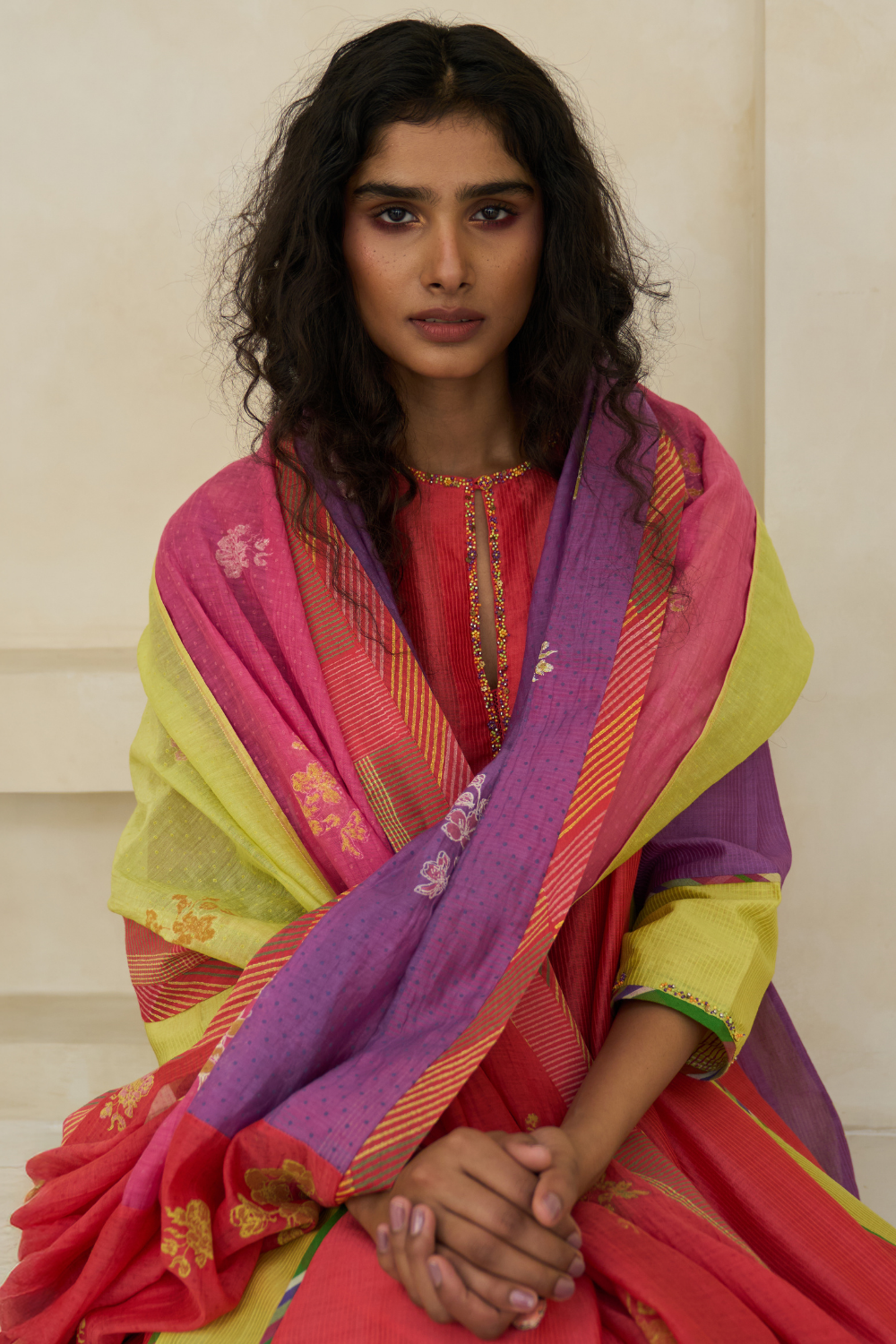 Kurta in handwoven 40 gm Chanderi, embellished with hand block printing and hand-worked beading. Comes with a 100% cotton slip.