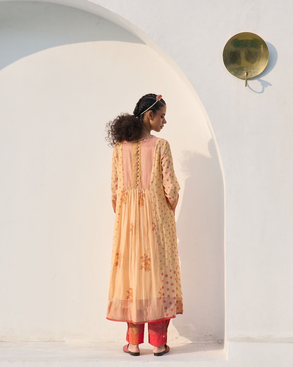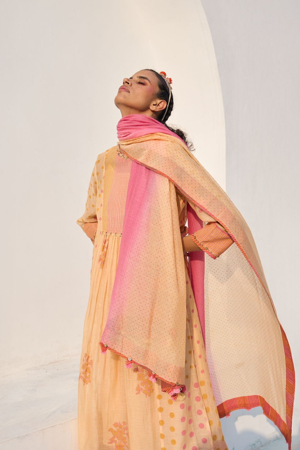 Her Chanderi carries its signature translucence and soft sheen, but with a subtlety that feels almost ethereal — printed slowly, consciously, through hand block printing that heightens the fabric's inherent delicacy.
