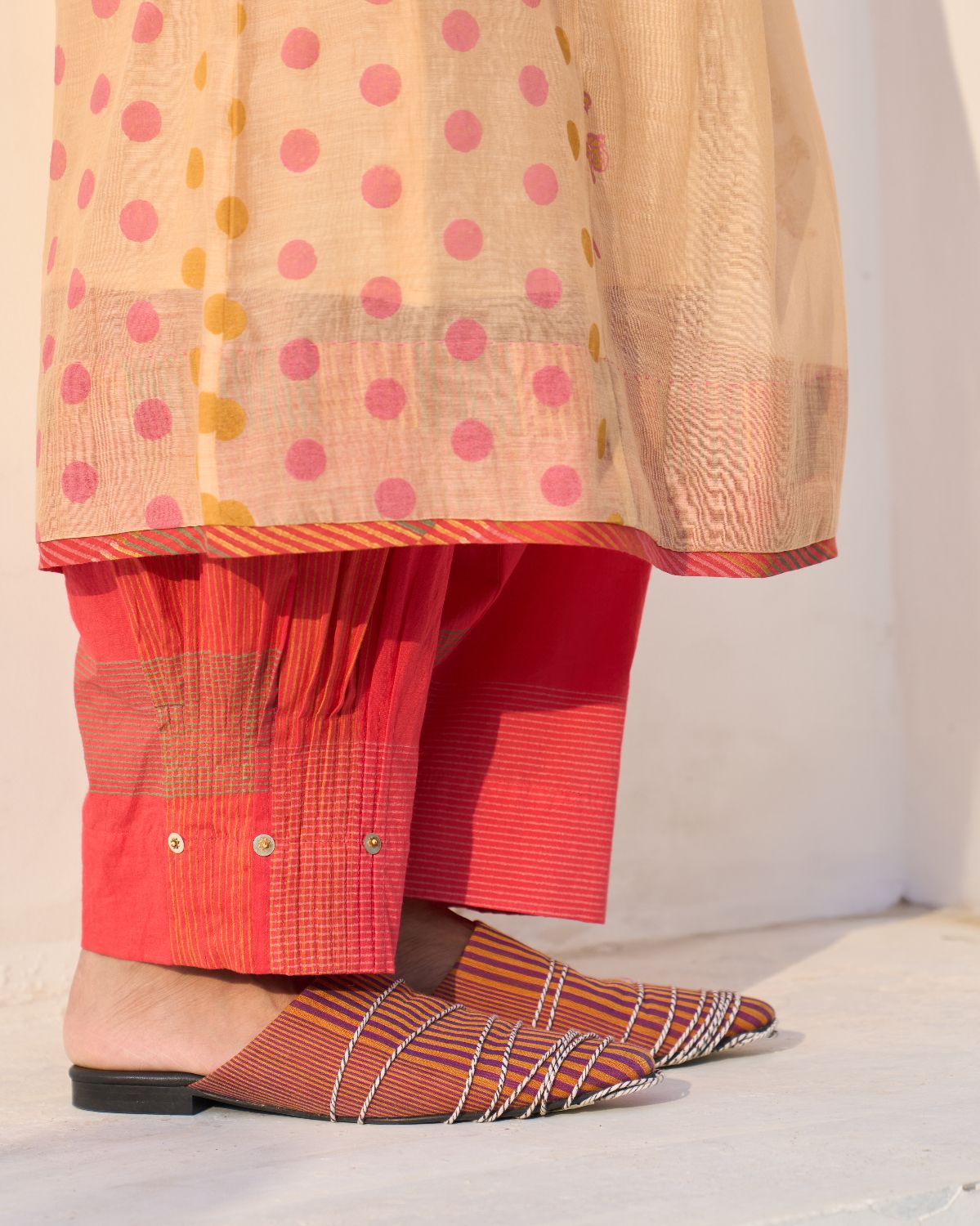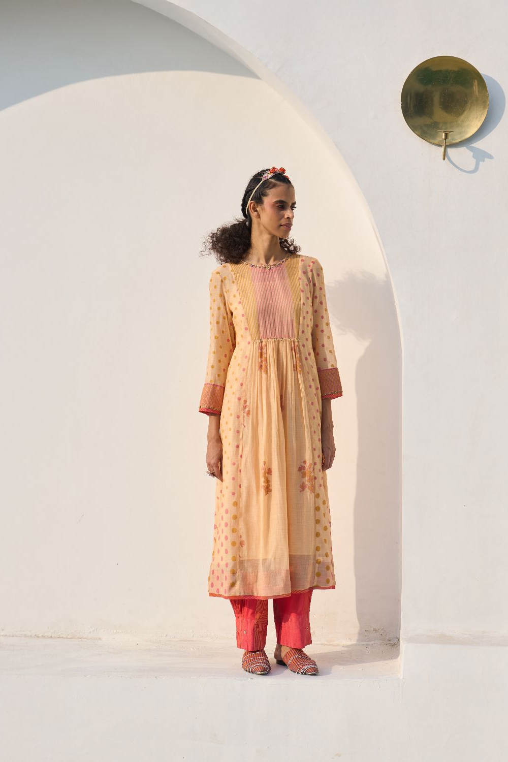 Swatti’s design language is anchored in India’s most storied textiles — Chanderi, handwoven cotton, and hand block-printed fabrics — yet her approach is unmistakably contemporary. She doesn’t simply use these textiles; she interprets them. She listens to their history, then rewrites their place in the modern wardrobe.