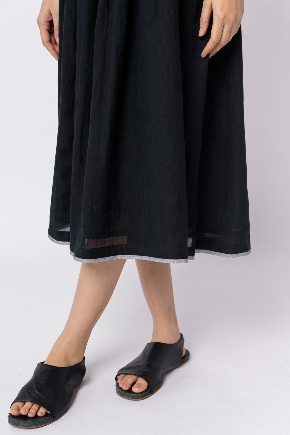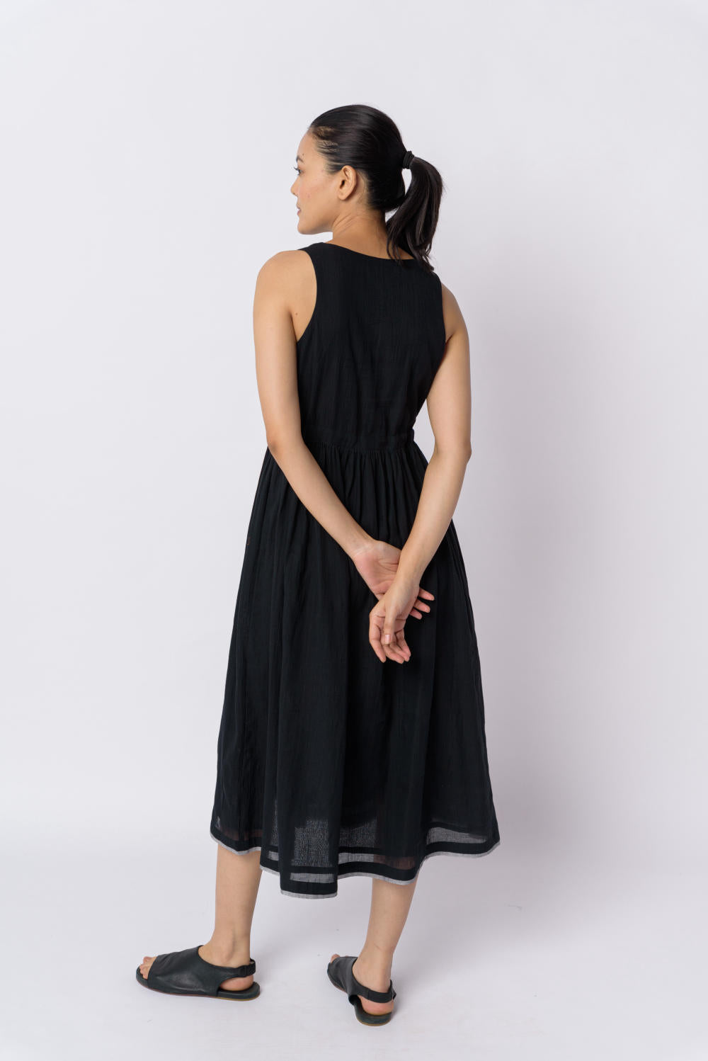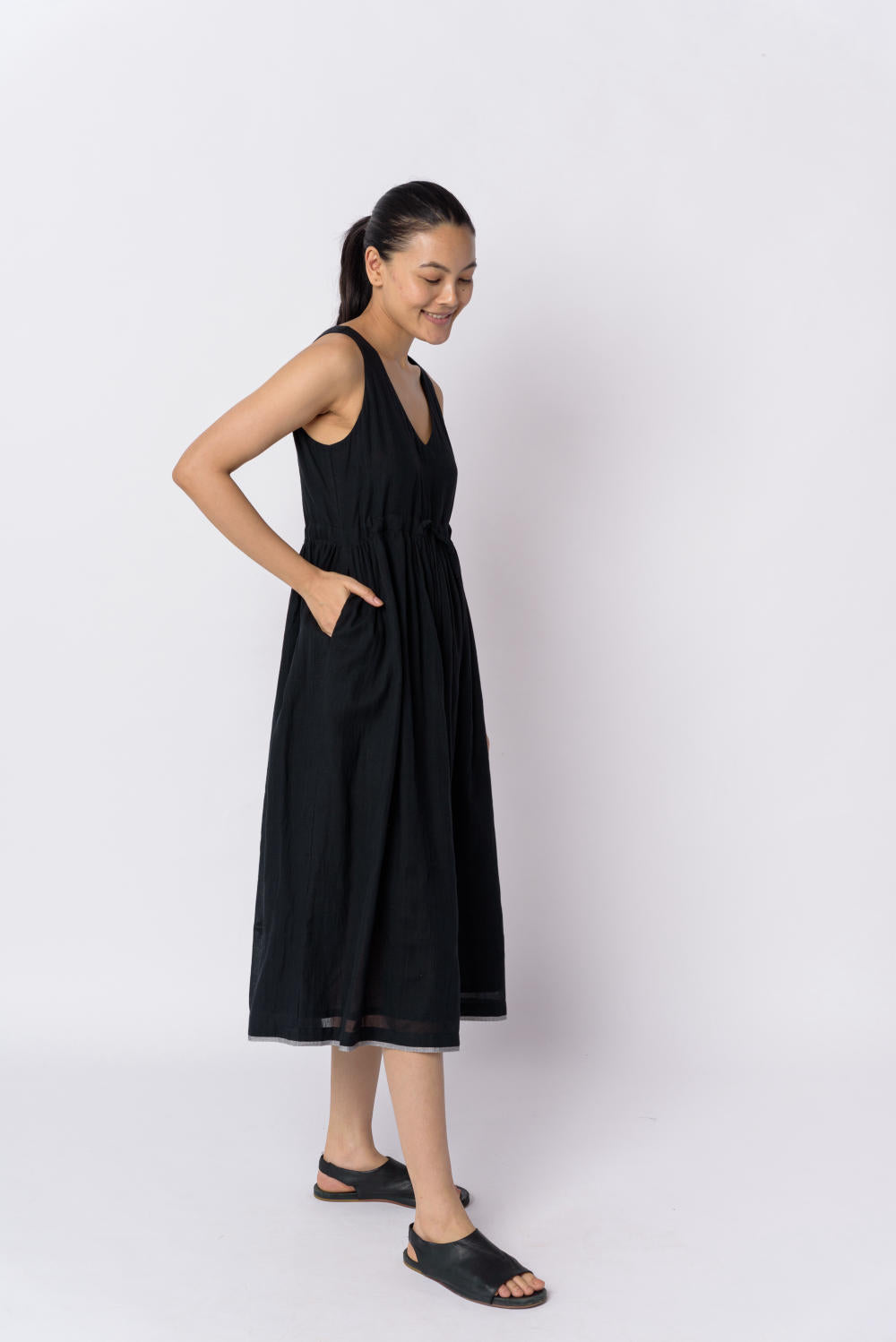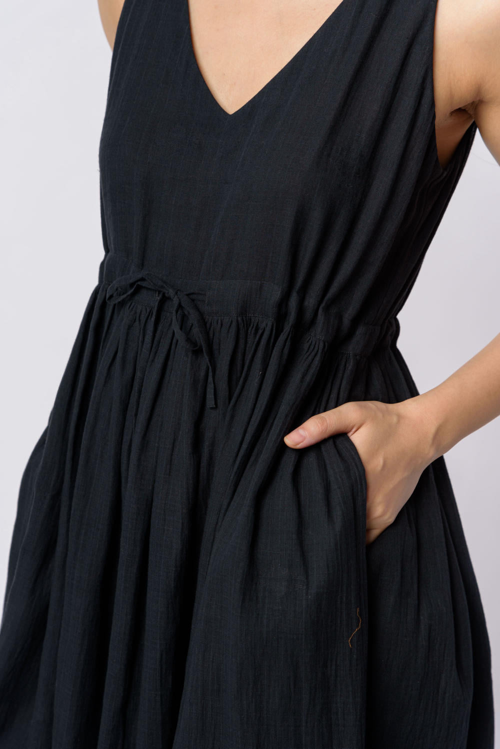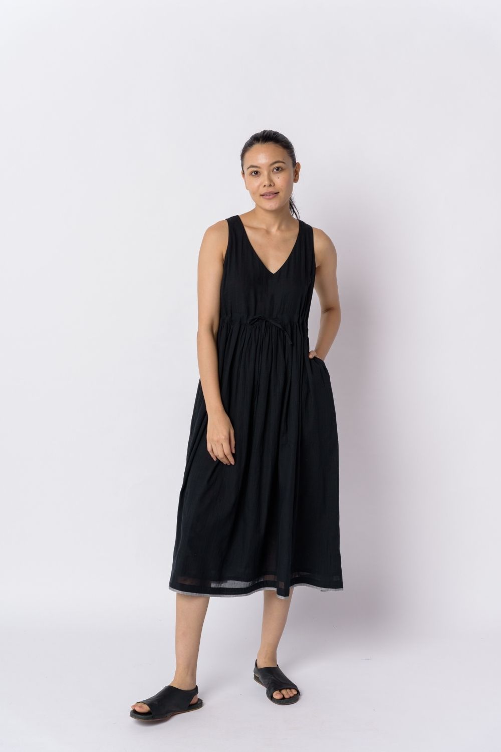 This classic black dress made from the softest cotton weaved by skilful artisans is a smart pick for year-round usability. The material is breathy and makes a great piece by itself or for layering with a long overlay. The solid color and airy texture add to the personality of the garment. It features a deep V-neckline and empire tie-up waistline that make it ideal for evening gatherings.