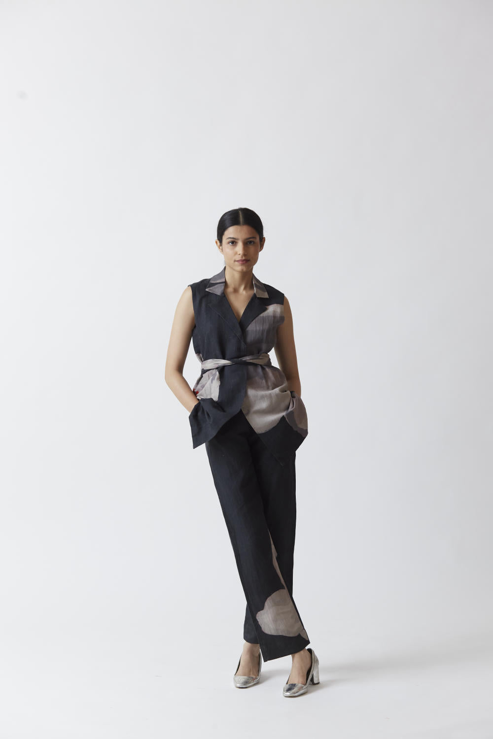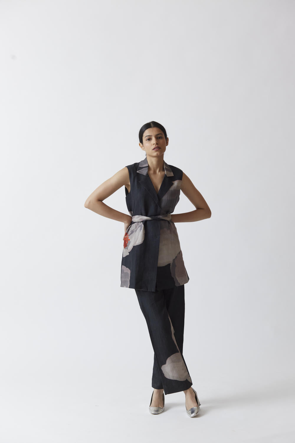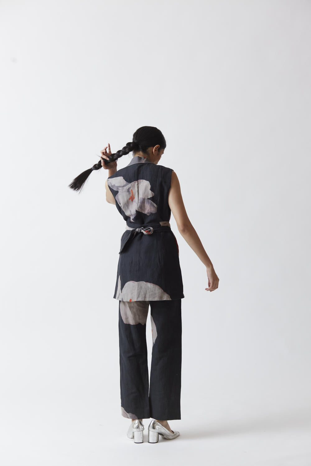 Pure linen jacket set in black with printed white poppies. The set