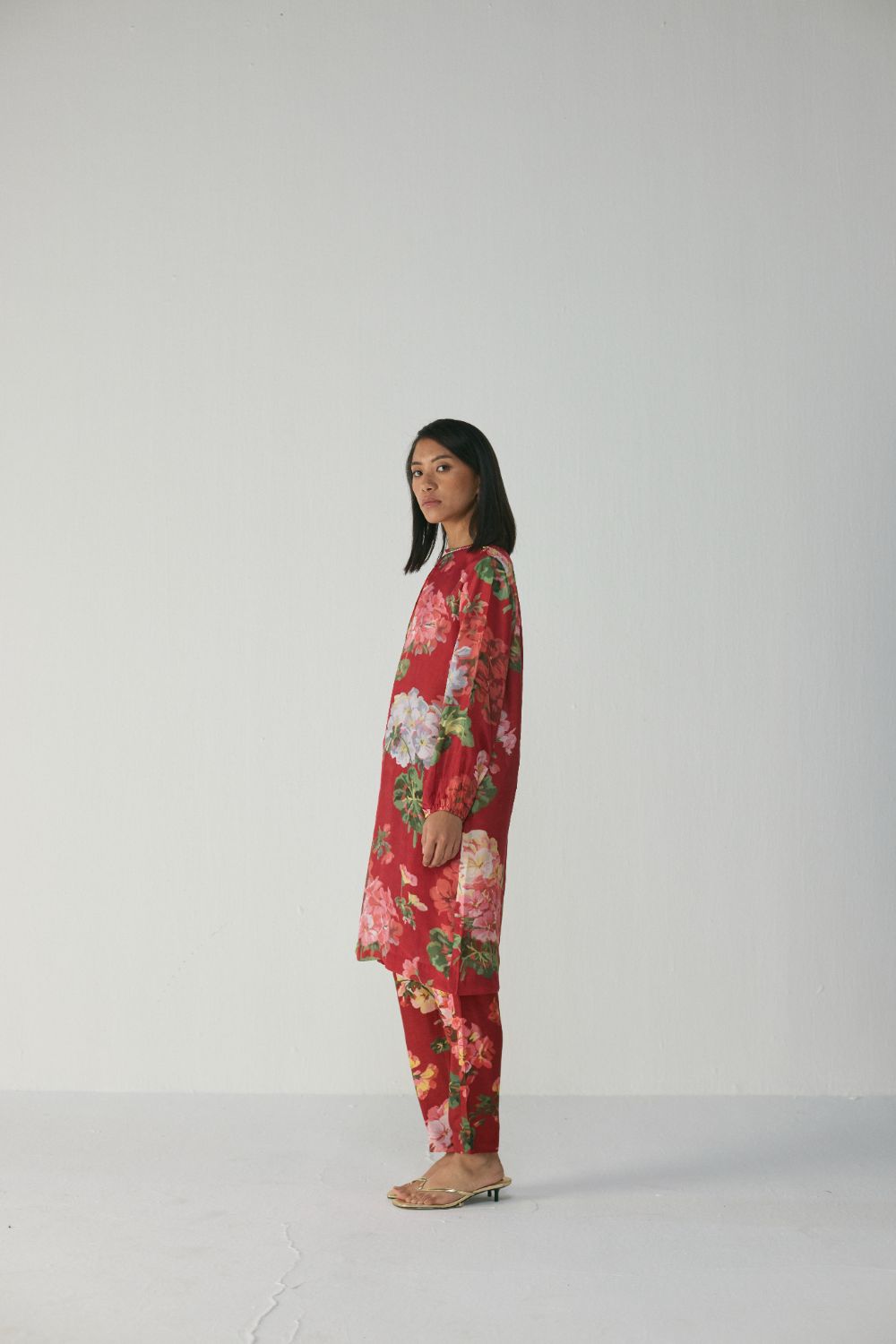 The outfit features a bold, vibrant floral print set against a deep crimson-red base. The florals are large, painterly, and multi-toned—ranging from soft lilacs and blush pinks to warm corals and lush greens—creating a rich, garden-inspired aesthetic. The print placement is scattered organically, giving the outfit an elegant yet contemporary artistic feel.