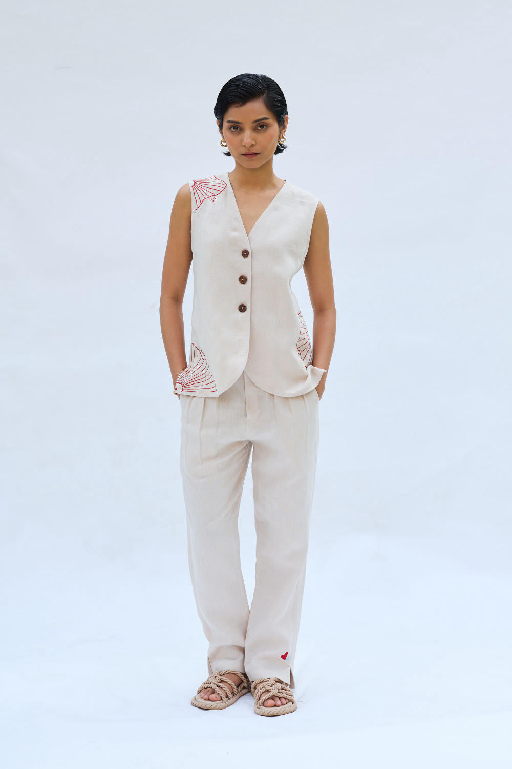 Regular fit, v-neck sleeveless, waistcoat top that buttons at the front, crafted in azo-free dyed linen fabric, machine embroidered with ocean-inspired motifs. This piece is a community favourite! Perfect for those semi-formal to formal moments but can easily be dressed down for casual days - a truly versatile look you can pair with anything.