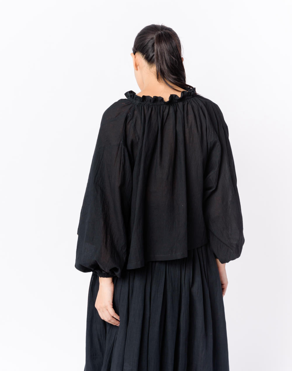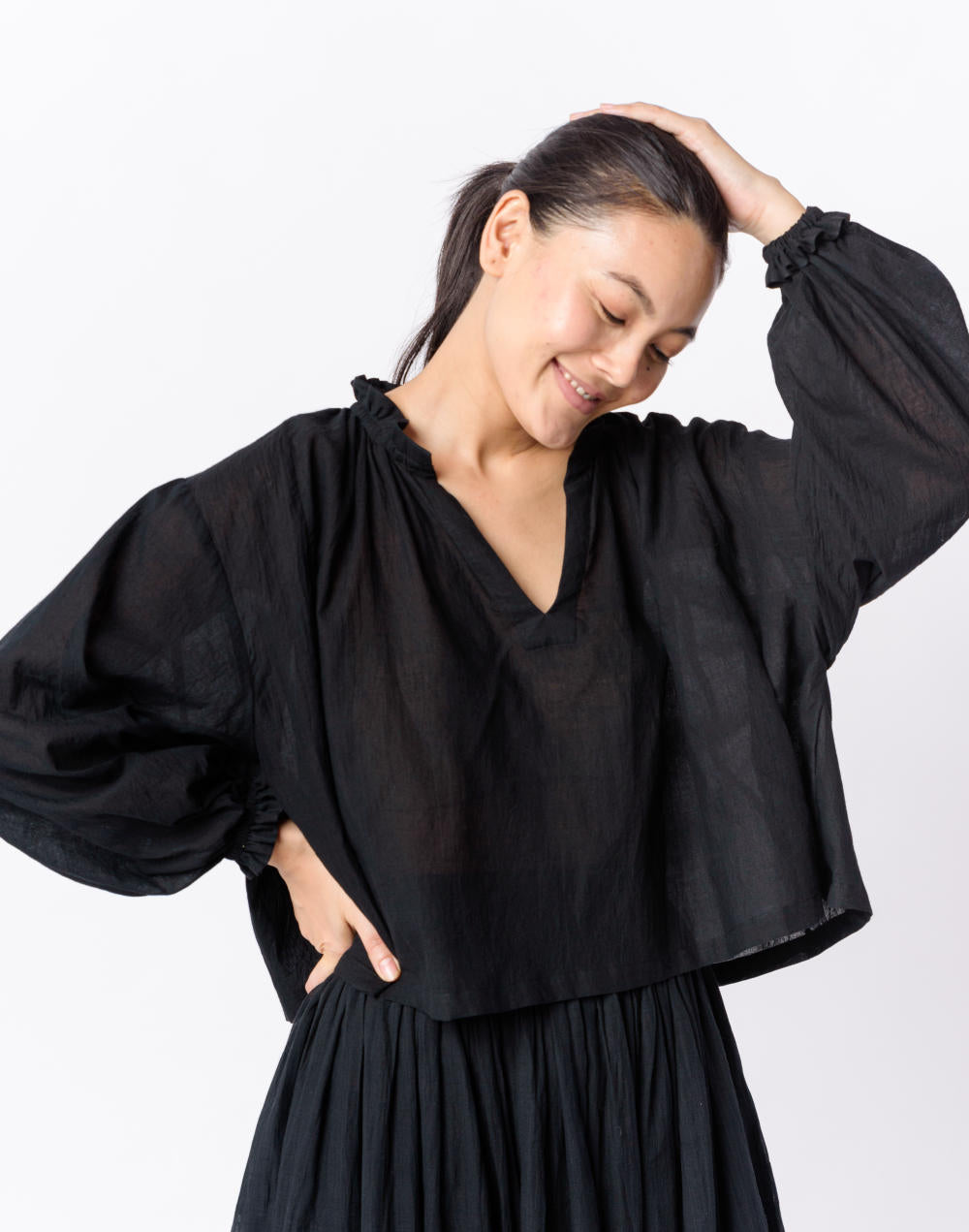 Monochrome black ensemble designed using breathable handwoven cotton fabric from the eastern region of India. Add style and comfort to everyday dressing in this swingy oversized short top with gentle gathers and roomy flare. Everyday staples that work just right for desk to dinner.