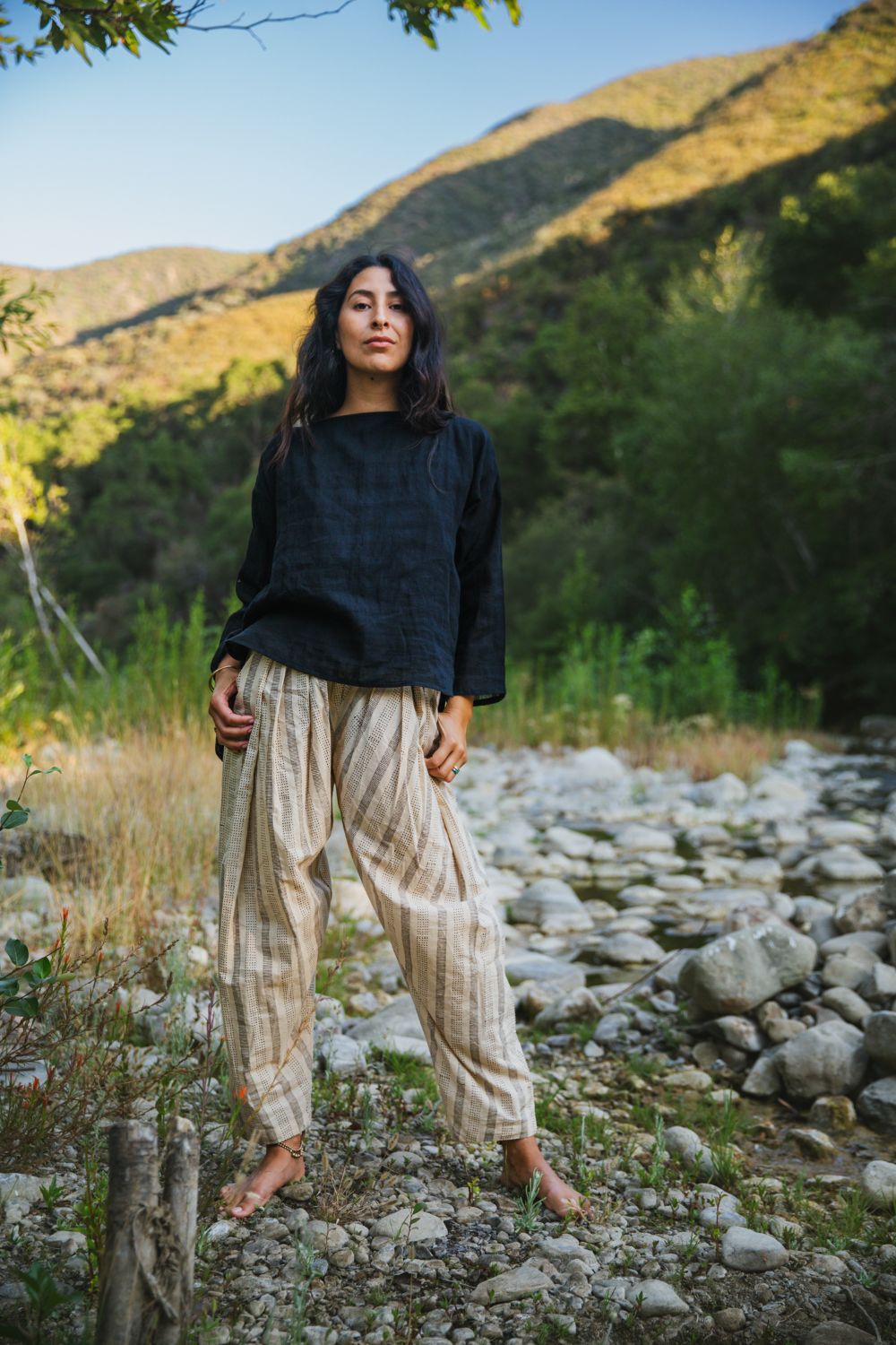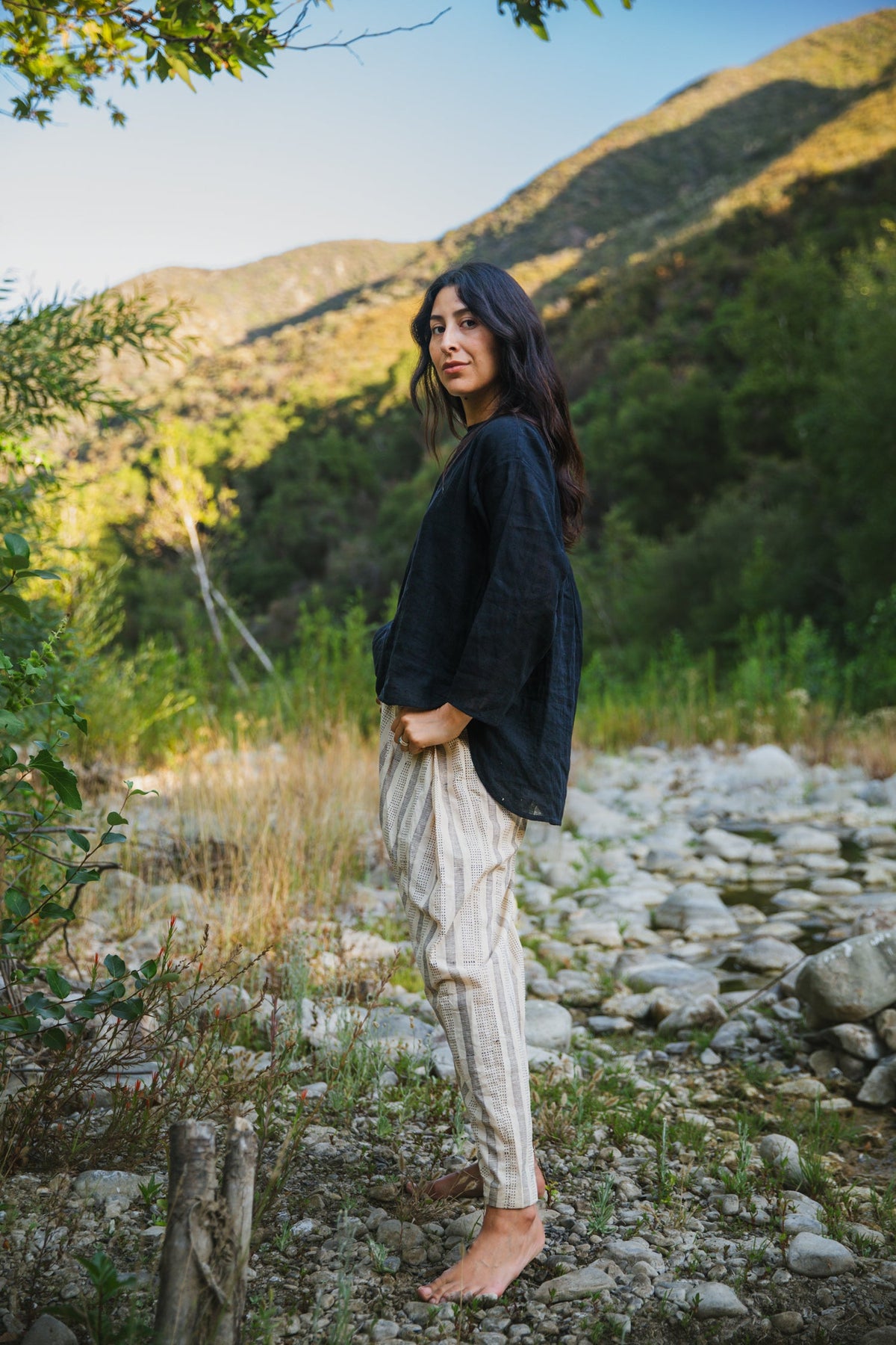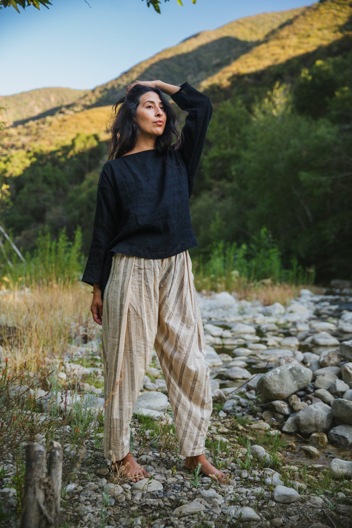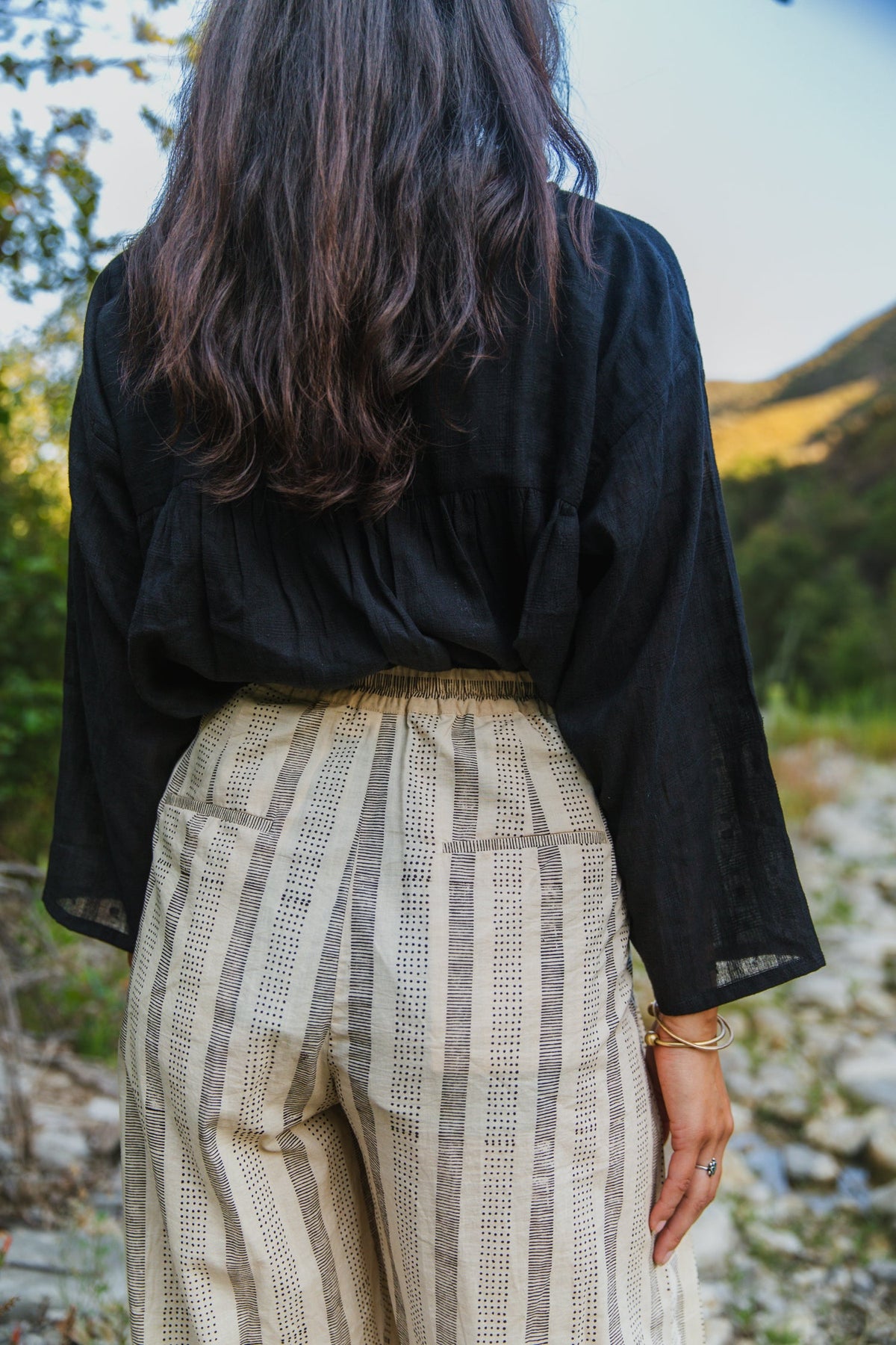 Designed in collaboration with Meredith Peck, this elegant black Jamdani top offers a relaxed, comfortable fit and a flowing silhouette. It features a flattering boat neckline with a single button closure at the back. The modern high-low hemline and 3/4 length sleeves make it a versatile piece for effortless style.