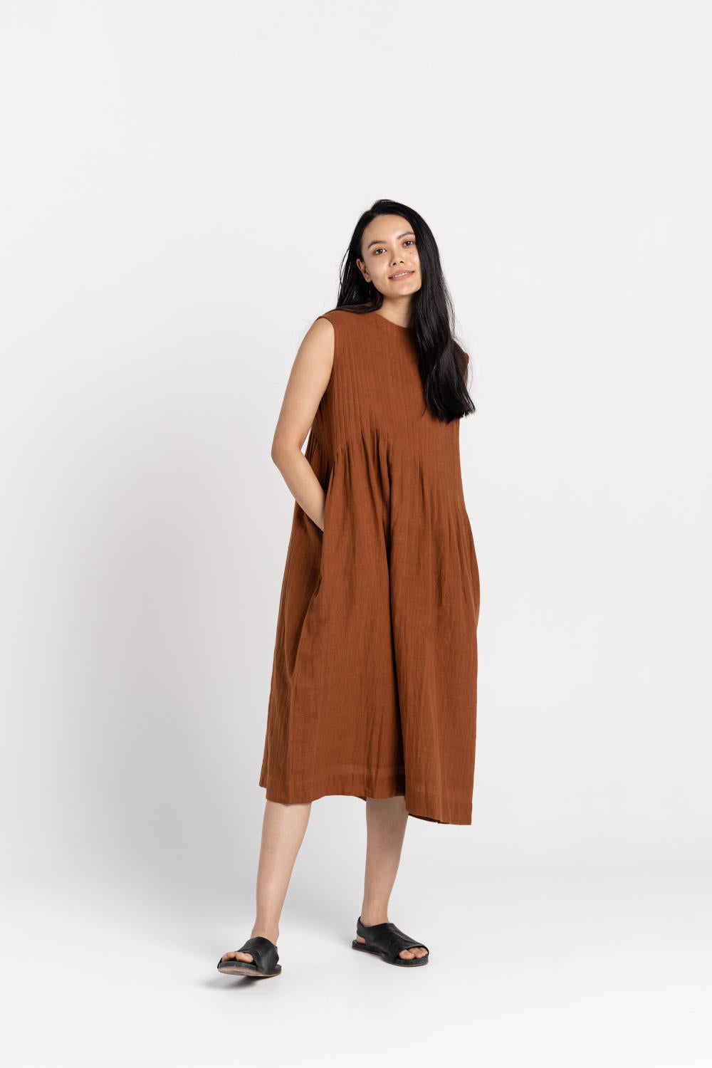 Turtle-neck long brown dress constructed from handwoven organic cotton fabric made by the weavers of Kutch. It has pleat details at the front and back, roomy hidden pockets and button closure with slit at the back. It is ideally worn as a dress for social/outdoor gatherings, casual meets or for getaways.