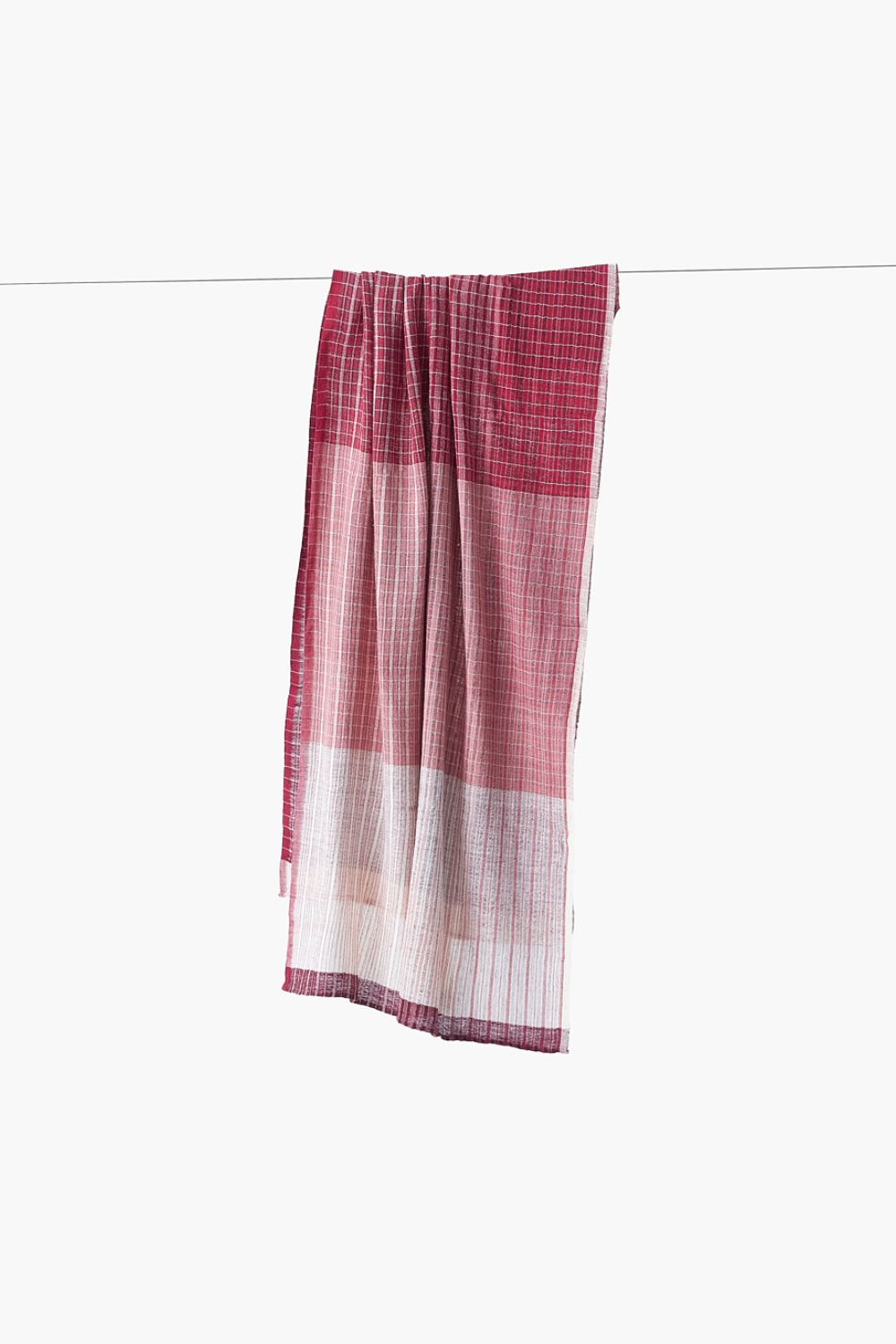 This luxurious hand-spun Maheshwari stole, crafted from pure cotton, features a modern color-block design transitioning from soft off-white to deep maroon. Both panels showcase a subtle textured grid, elegantly framed by a thin red border and finished with delicate fringe. Dyed with azo-free vat colors, it offers a stylish, safe, and timeless accessory.