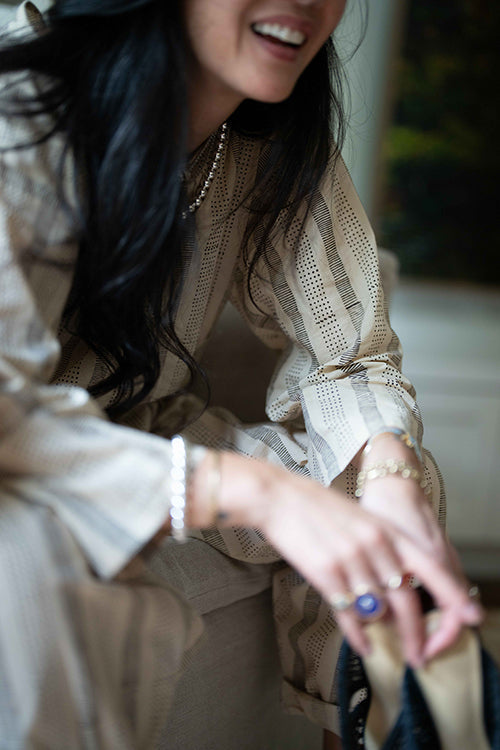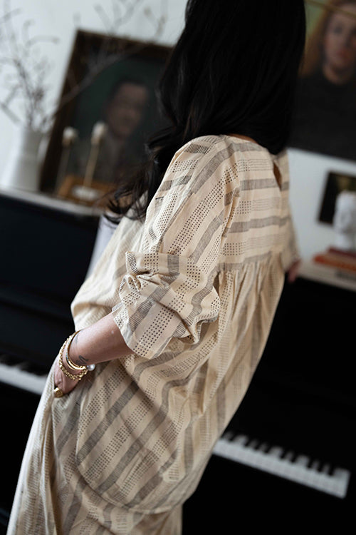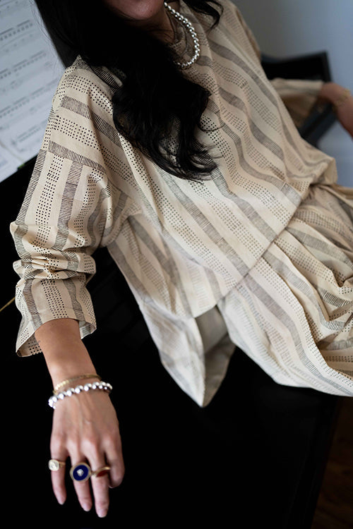 Designed in collaboration with Meredith Peck, this elegant, relaxed-fit top elevates your everyday style. The beige top features a unique black striped and dotted block print and a flattering, wide boat neckline with a single button closure at the back. With its modern high-low hem and 3/4 length sleeves, this piece drapes beautifully for an effortlessly chic look.