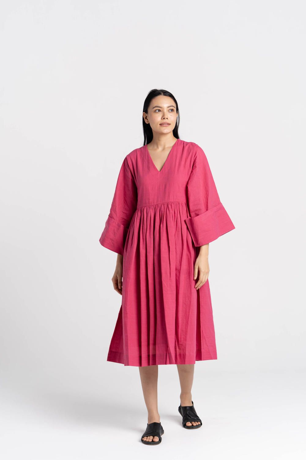 Sorbet pink gathered midi dress comes in a vibrant hue of soft, textured cotton. The V-shaped neckline and oversized sleeves make it perfect for modern women. It has a gentle, yet playful, rolled up hem and is handmade from pure cotton fabric by the local weavers of West Bengal.