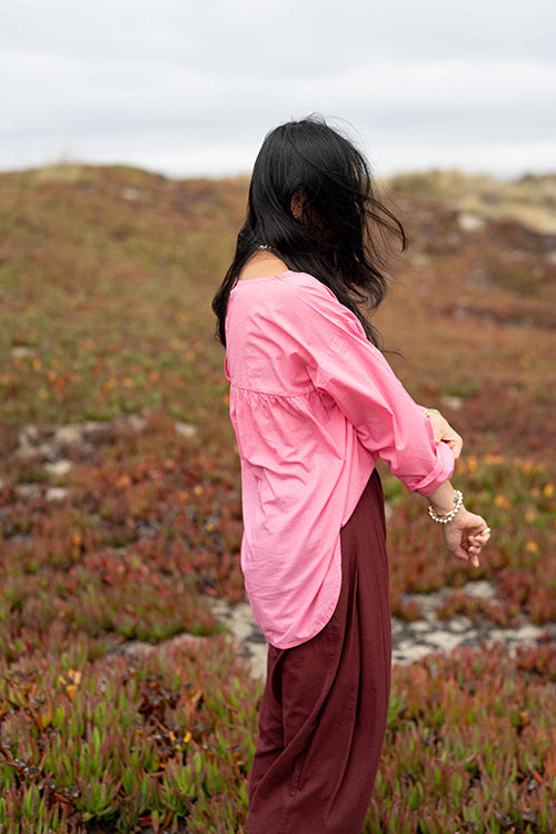 Designed In collaboration with Meredith Peck, this vibrant pink top offers a relaxed, comfortable fit with a flattering boat neckline with a single button closure at the back and a wide, flowing silhouette. The modern high-low hemline and 3/4 length sleeves make it a versatile piece for effortless style.