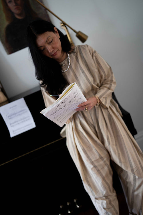 Their silhouettes—relaxed, modern, quietly poetic—carry a language of ease and intention. Natural dyes, azo-free pigments, and slow-woven textiles result in garments that feel honest: soft on the skin, kind to the earth, and deeply respectful of the communities who create them. Each piece is cut and stitched only when ordered, honouring the principle that beauty need not come at the cost of excess.
