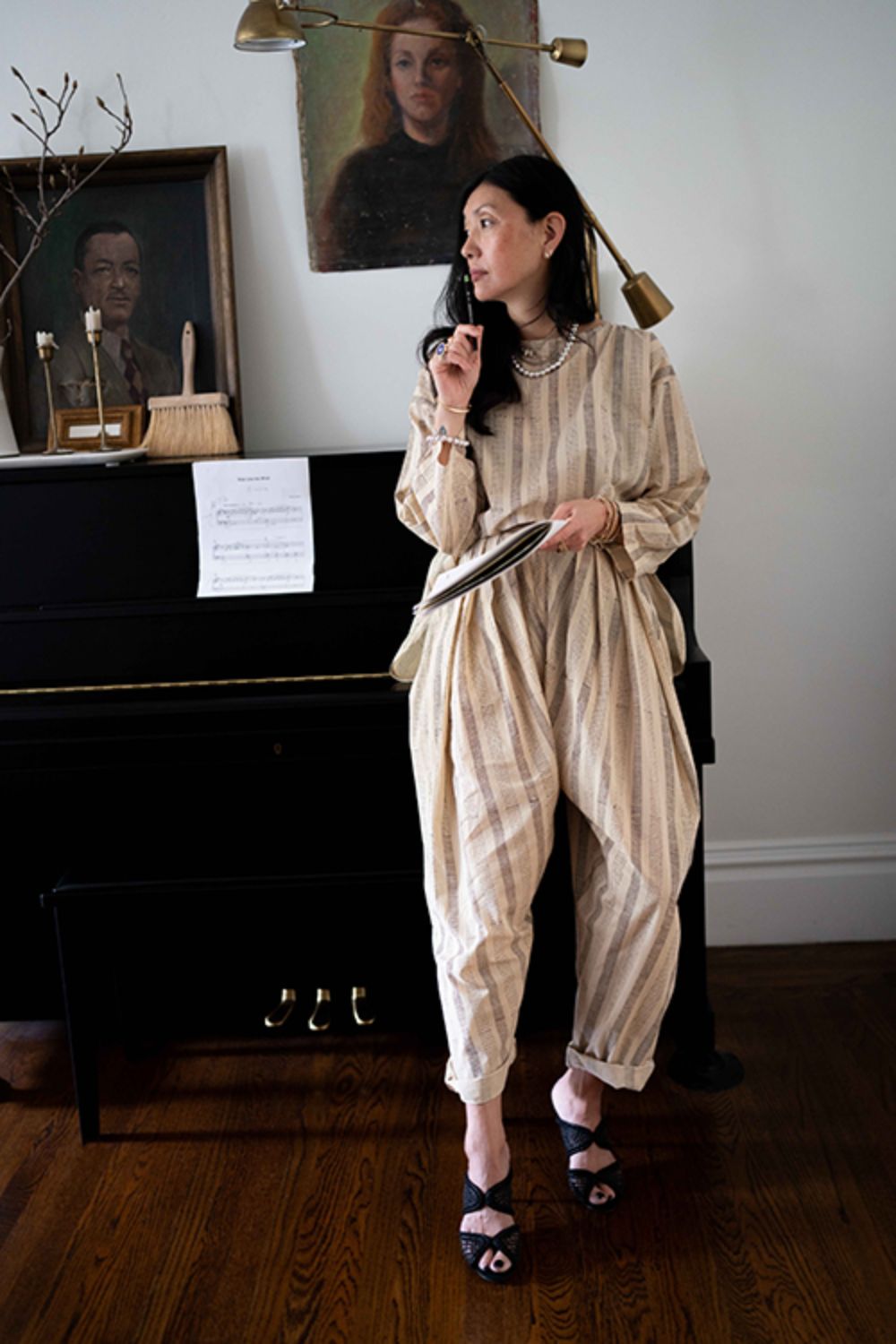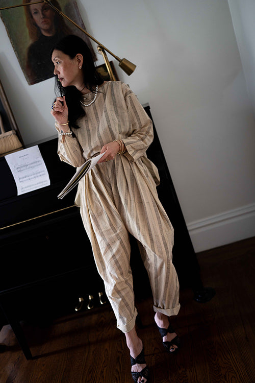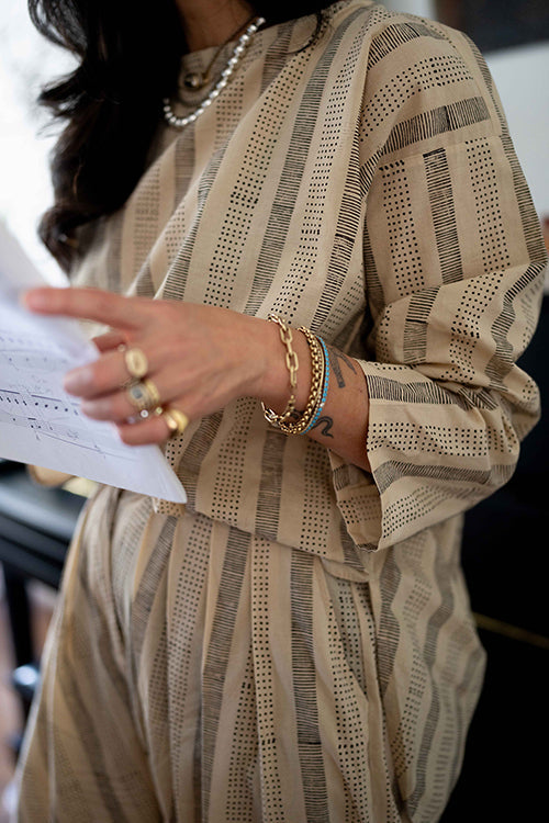Crafted in collaboration with Meredith Peck, this elegant two-piece ensemble pairs a sandstone stripe top with dune pants. It highlights a unique black striped and dotted block print and a relaxed, bohemian style focused on comfort and a free-flowing silhouette.