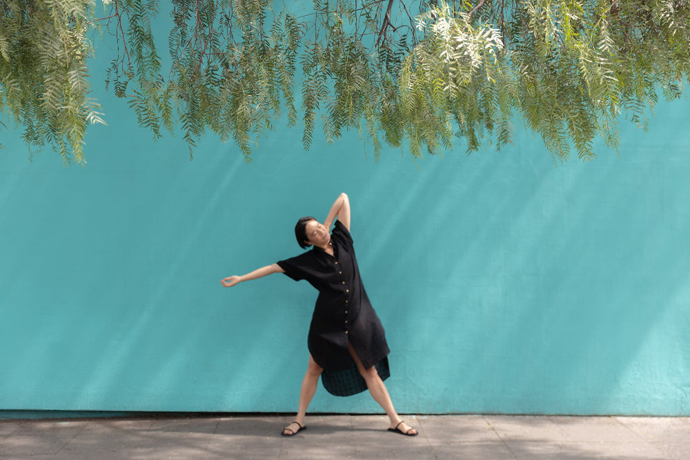 Their silhouettes—relaxed, modern, quietly poetic—carry a language of ease and intention. Natural dyes, azo-free pigments, and slow-woven textiles result in garments that feel honest: soft on the skin, kind to the earth, and deeply respectful of the communities who create them. Each piece is cut and stitched only when ordered, honouring the principle that beauty need not come at the cost of excess.
