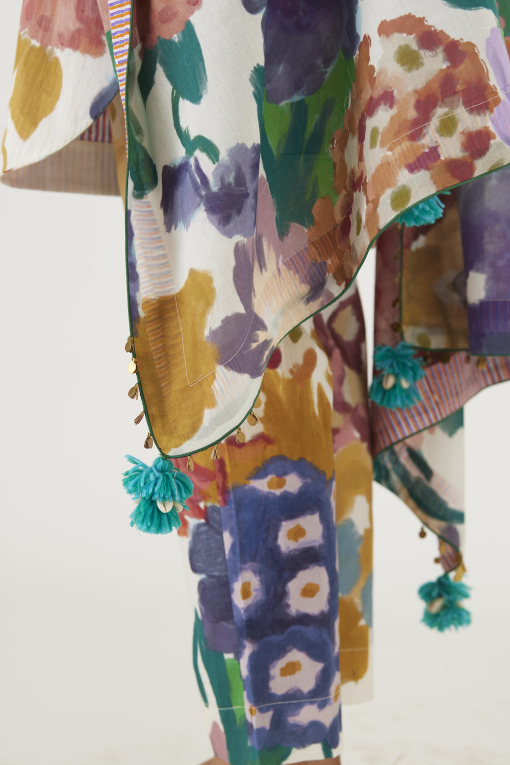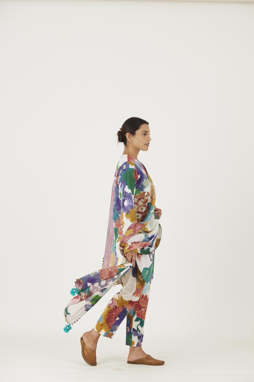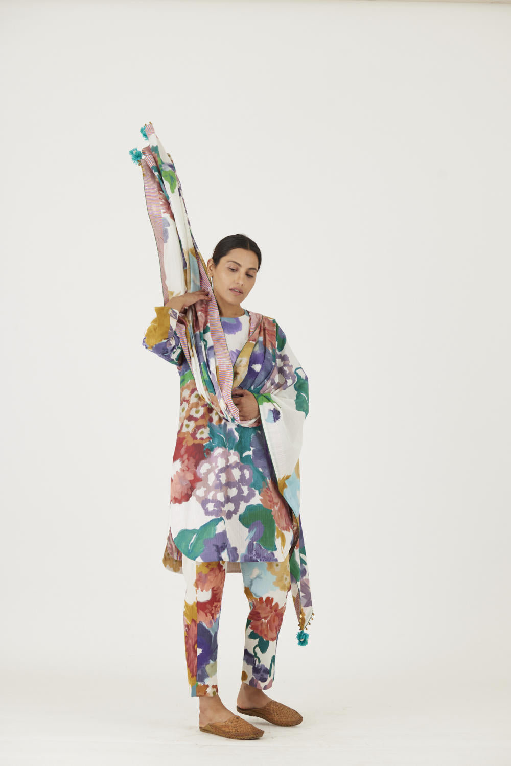 The print features an abundance of roses along with marigolds and jasmines arranged together in a bouquet on a summer white base. The dupatta is in mulmul and has a 2" wide striped facing . The kurta is finished with tassel bunches and metal hangings on the edges.