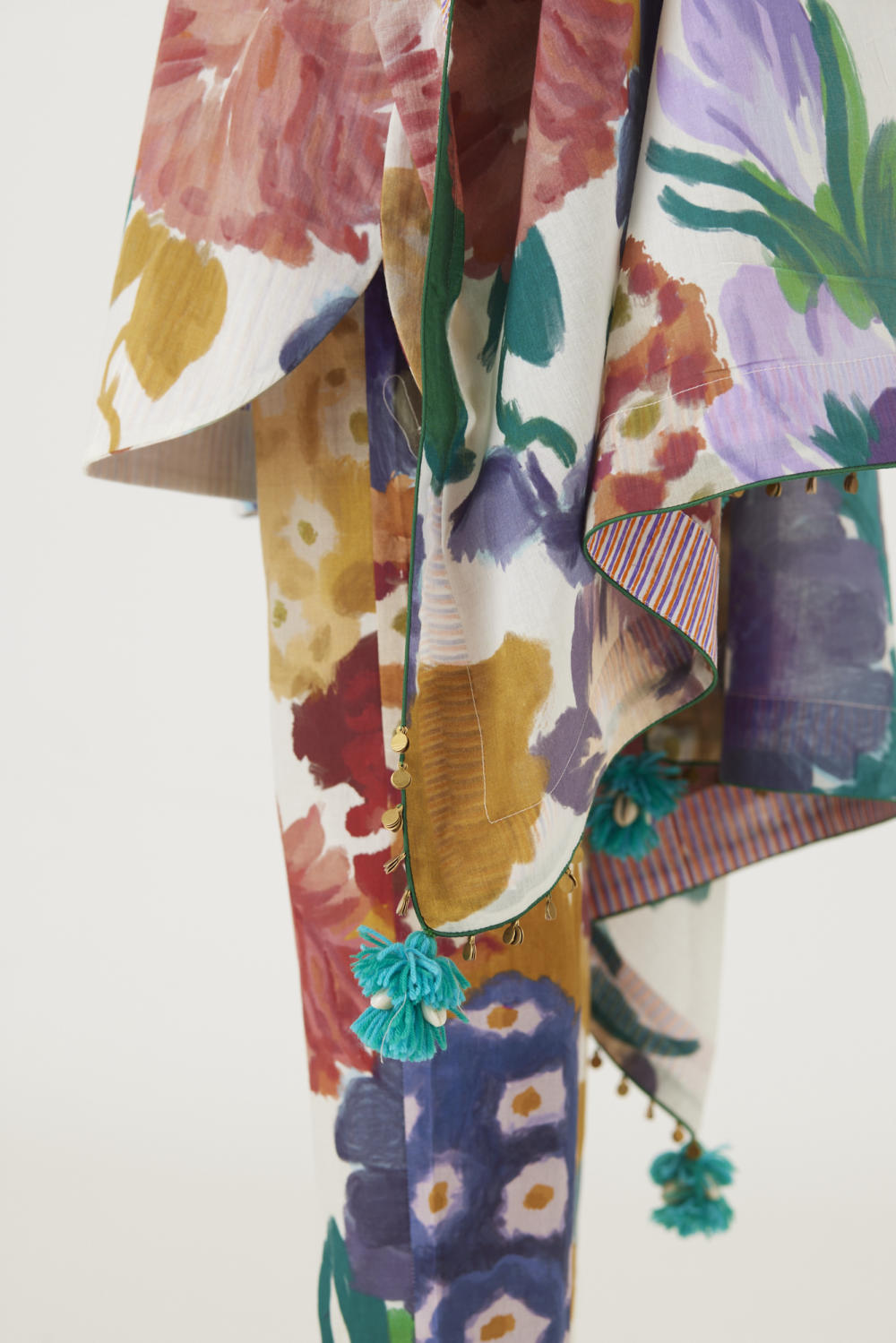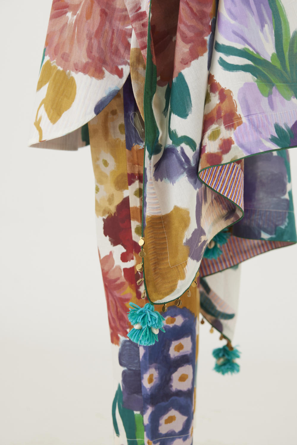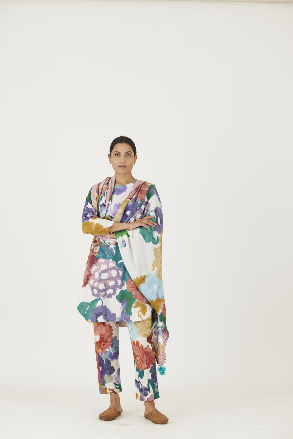 The print features an abundance of roses along with marigolds and jasmines arranged together in a bouquet on a summer white base. The dupatta is in mulmul and has a 2" wide striped facing . The kurta is finished with tassel bunches and metal hangings on the edges.