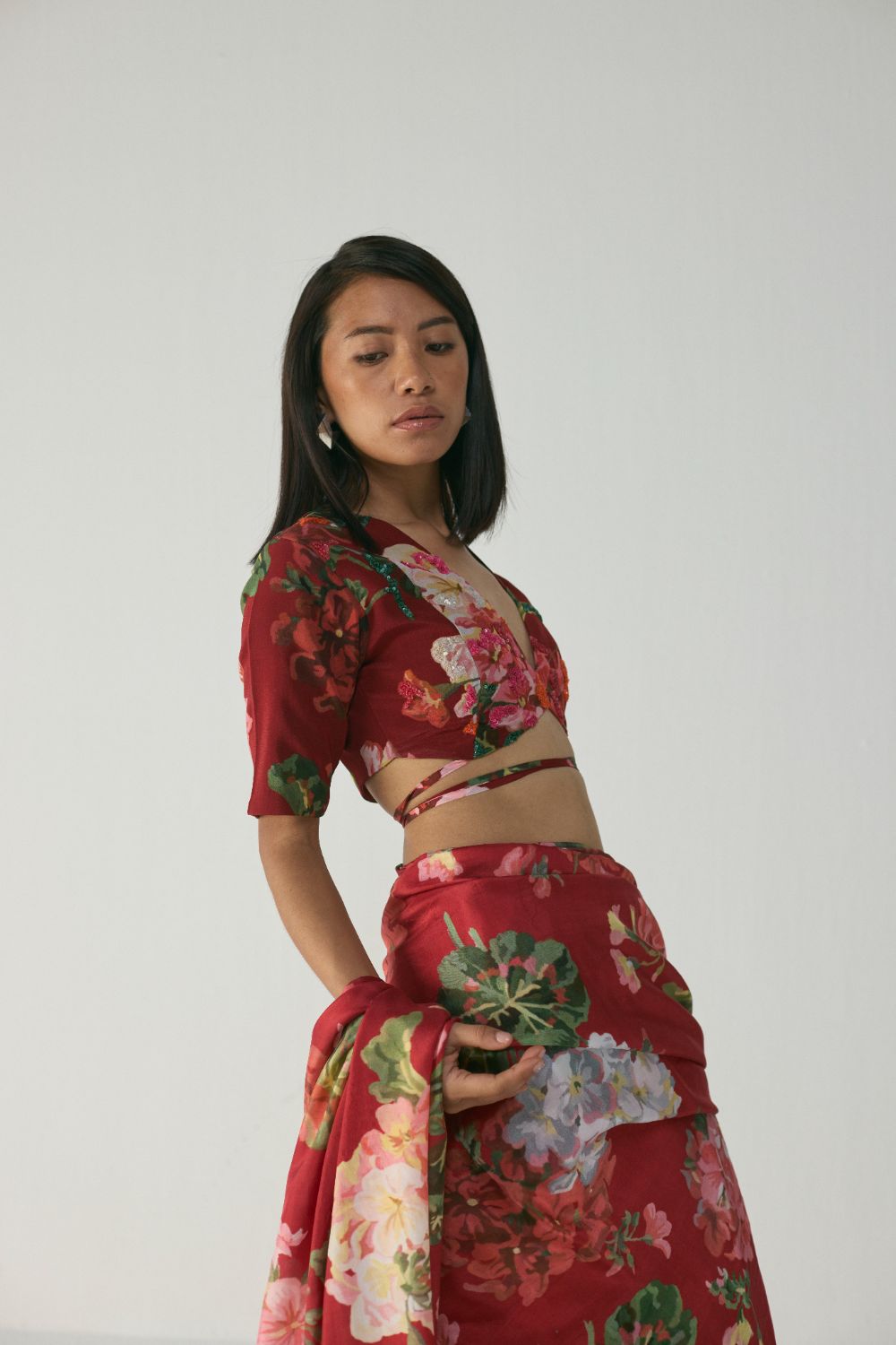 This stunning blouse features a rich, deep red base adorned with an artistic floral print inspired by lush garden blooms. The print brings together layered petals, soft gradients, and painterly strokes in shades of pink, green, white, and coral—creating a romantic yet contemporary visual appeal. The blouse showcases a bold plunging neckline highlighted with intricate hand-embroidered sequins that add dimension and a subtle sparkle.