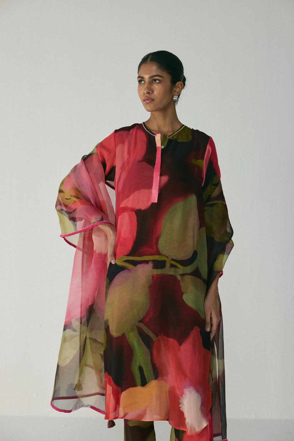 Print: Abstract artistic print in deep reds, fuchsias, lush greens, and soft purples.