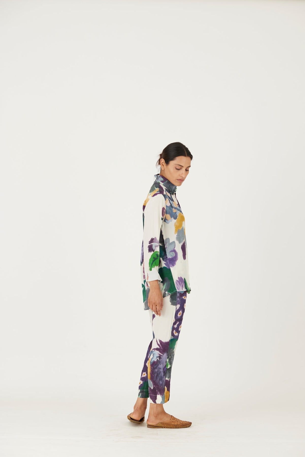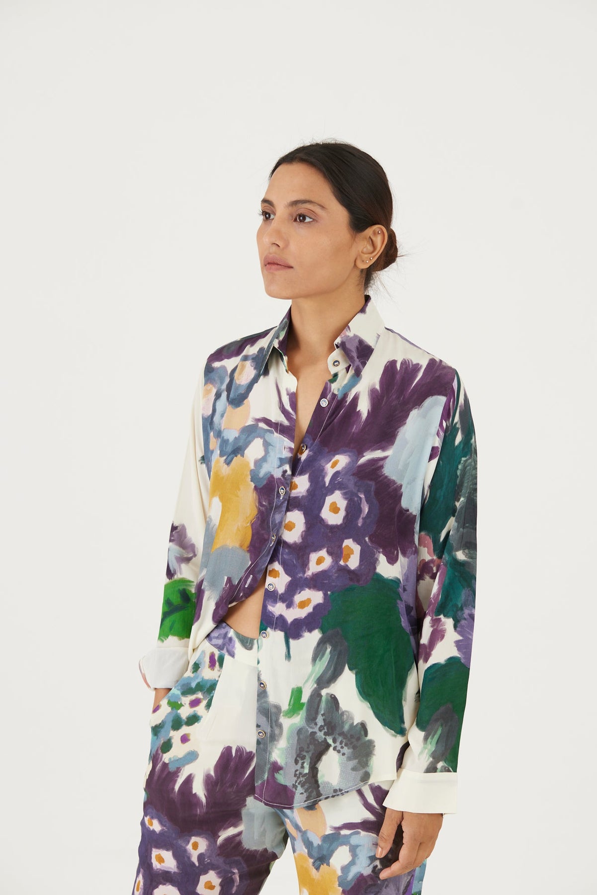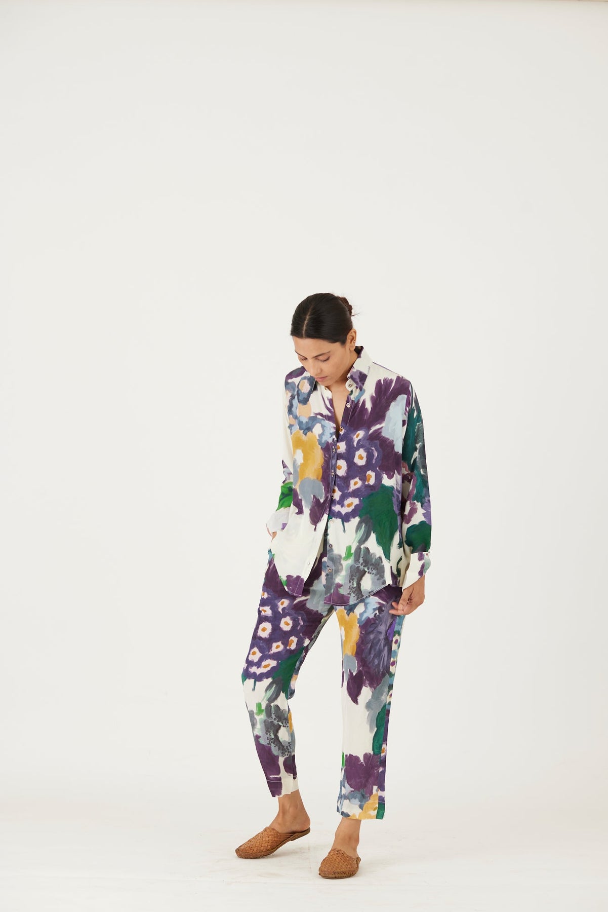 The print features an abundance of roses along with marigolds and jasmines arranged together in a bouquet on summer white base with florals in shades of blue. The set includes a button down shirt with back gathers and straight pants.