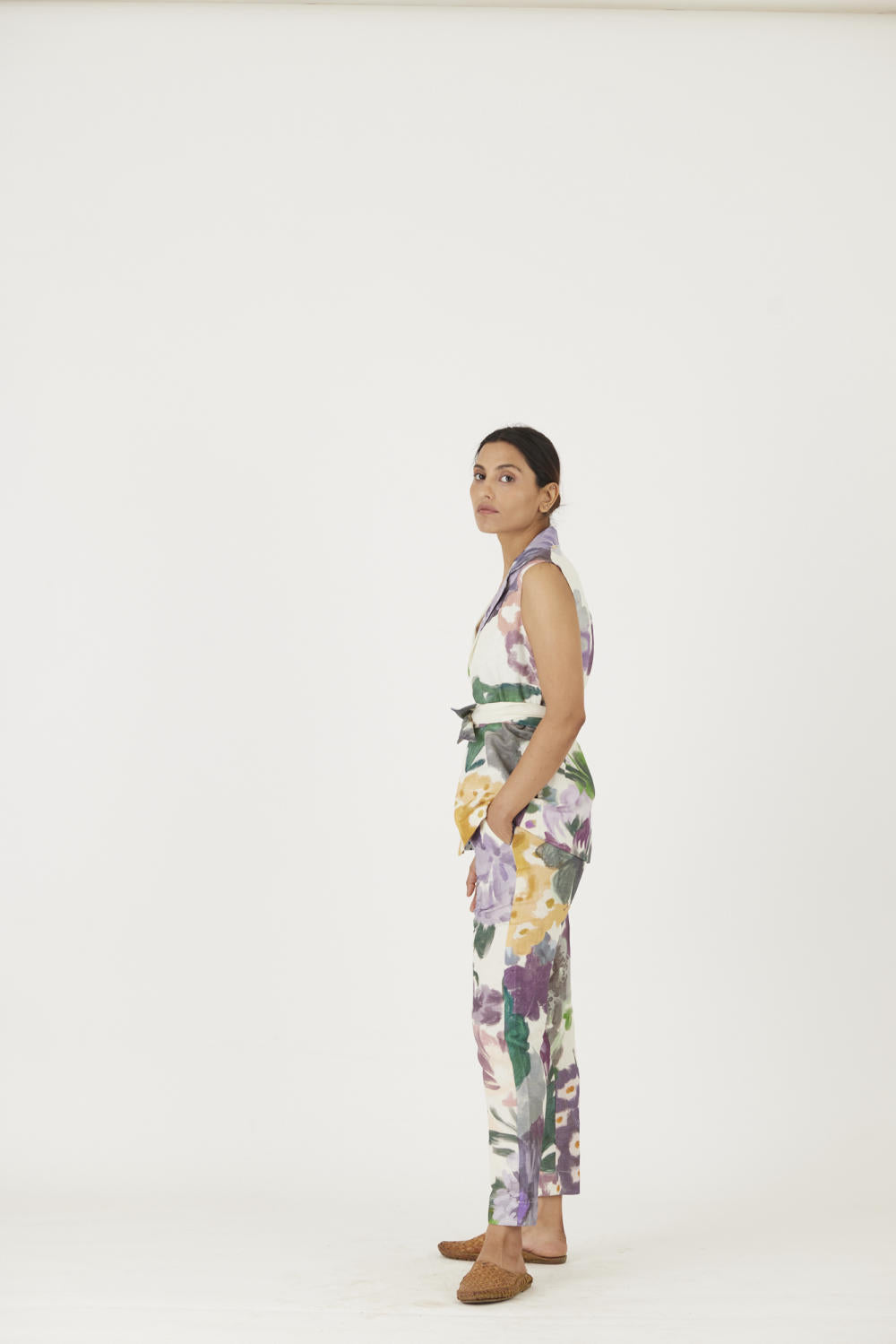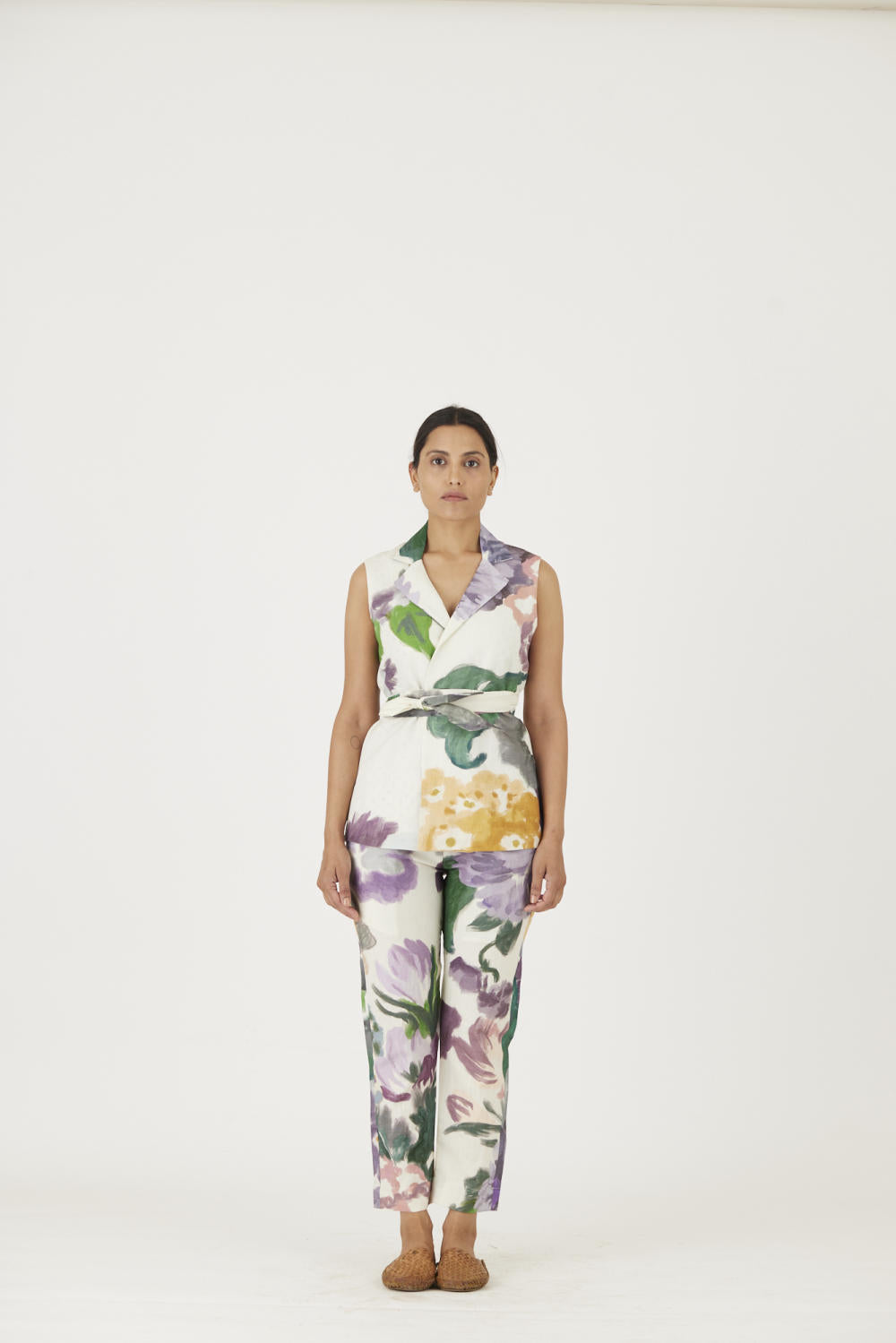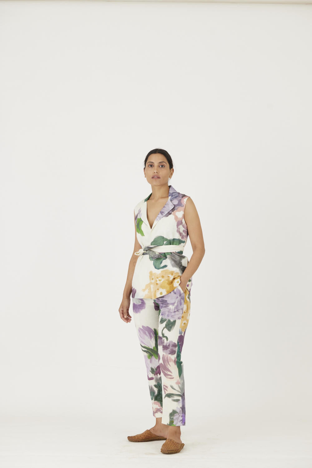 The print features an abundance of roses along with marigolds and jasmines arranged together in a bouquet on summer white base with florals in shades of blue. The set features a jacket with belt and pants in complimenting print.