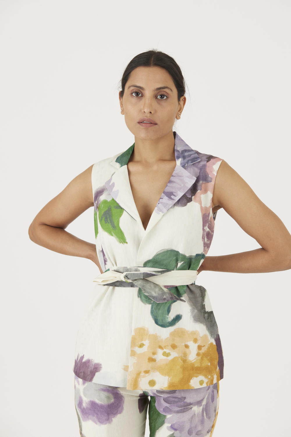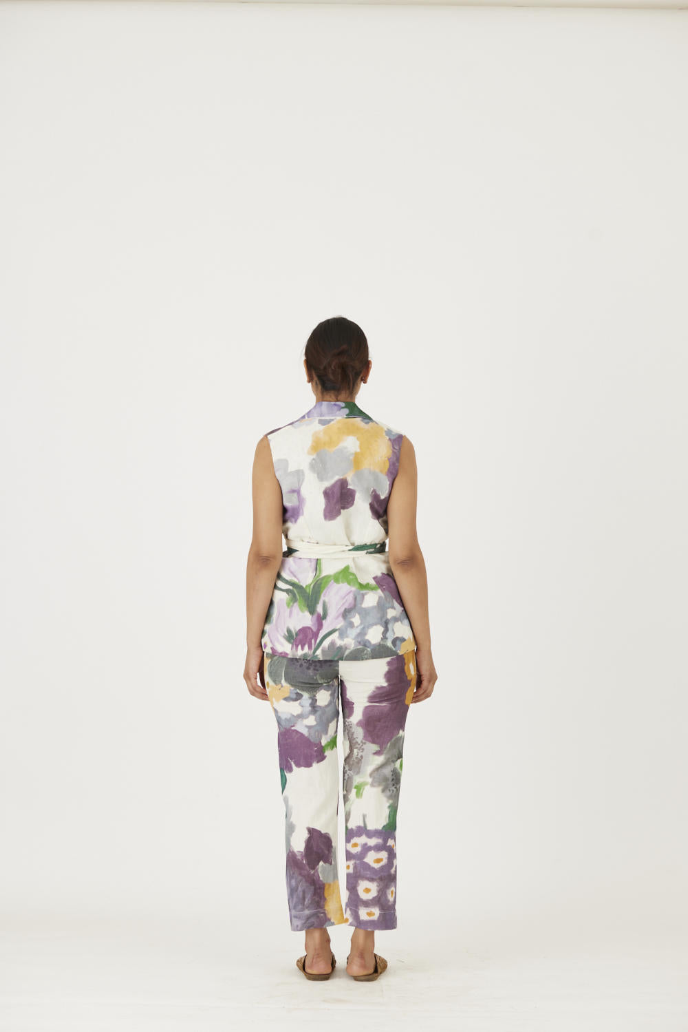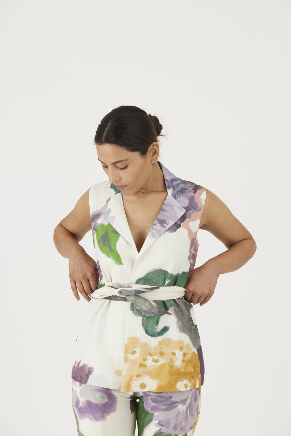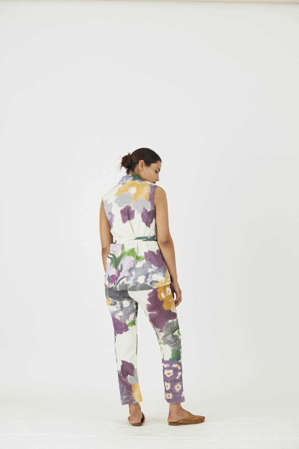 The print features an abundance of roses along with marigolds and jasmines arranged together in a bouquet on summer white base with florals in shades of blue. The set features a jacket with belt and pants in complimenting print.