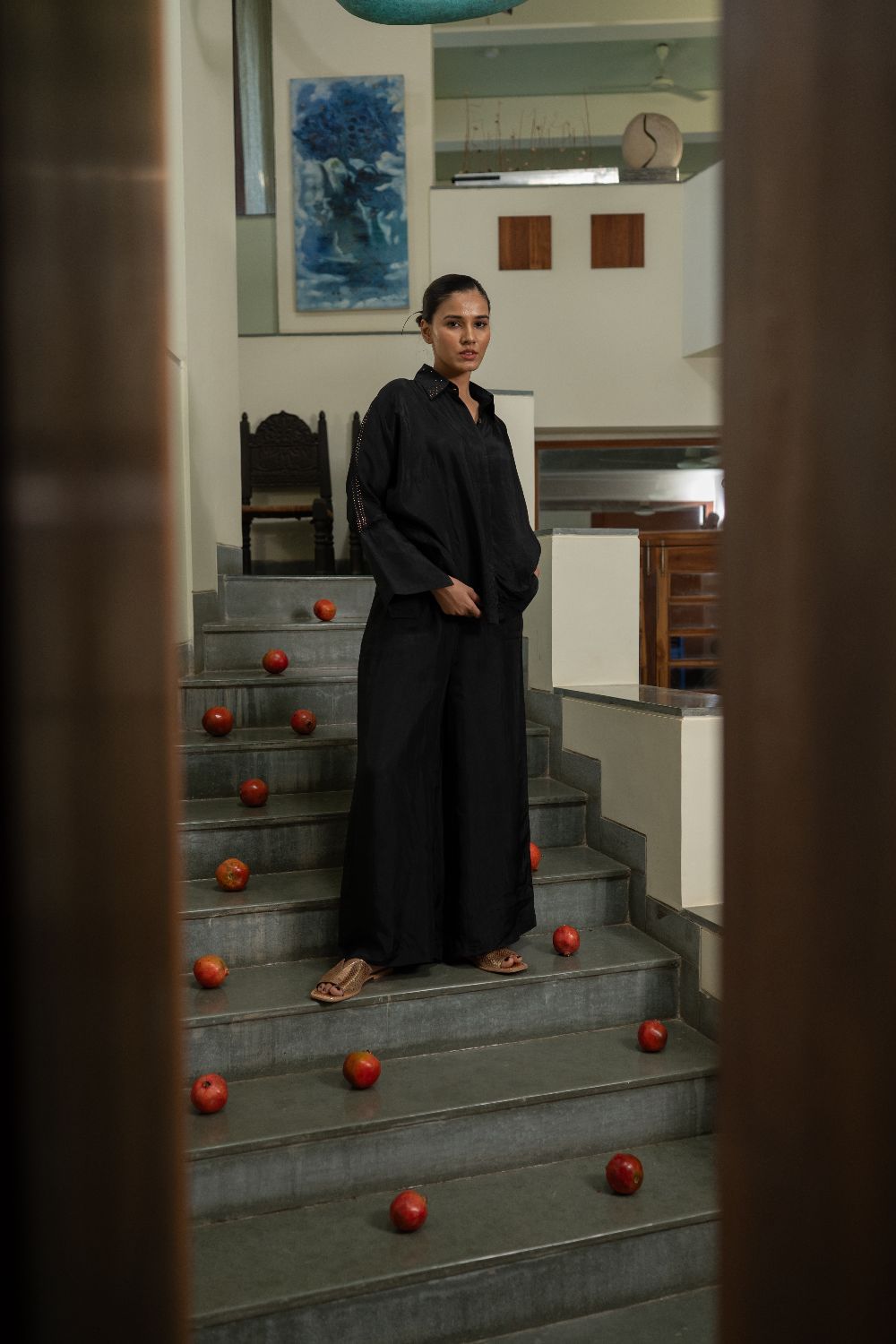 The matching straight-leg trousers bring balance, creating a set that’s as effortless as it is refined