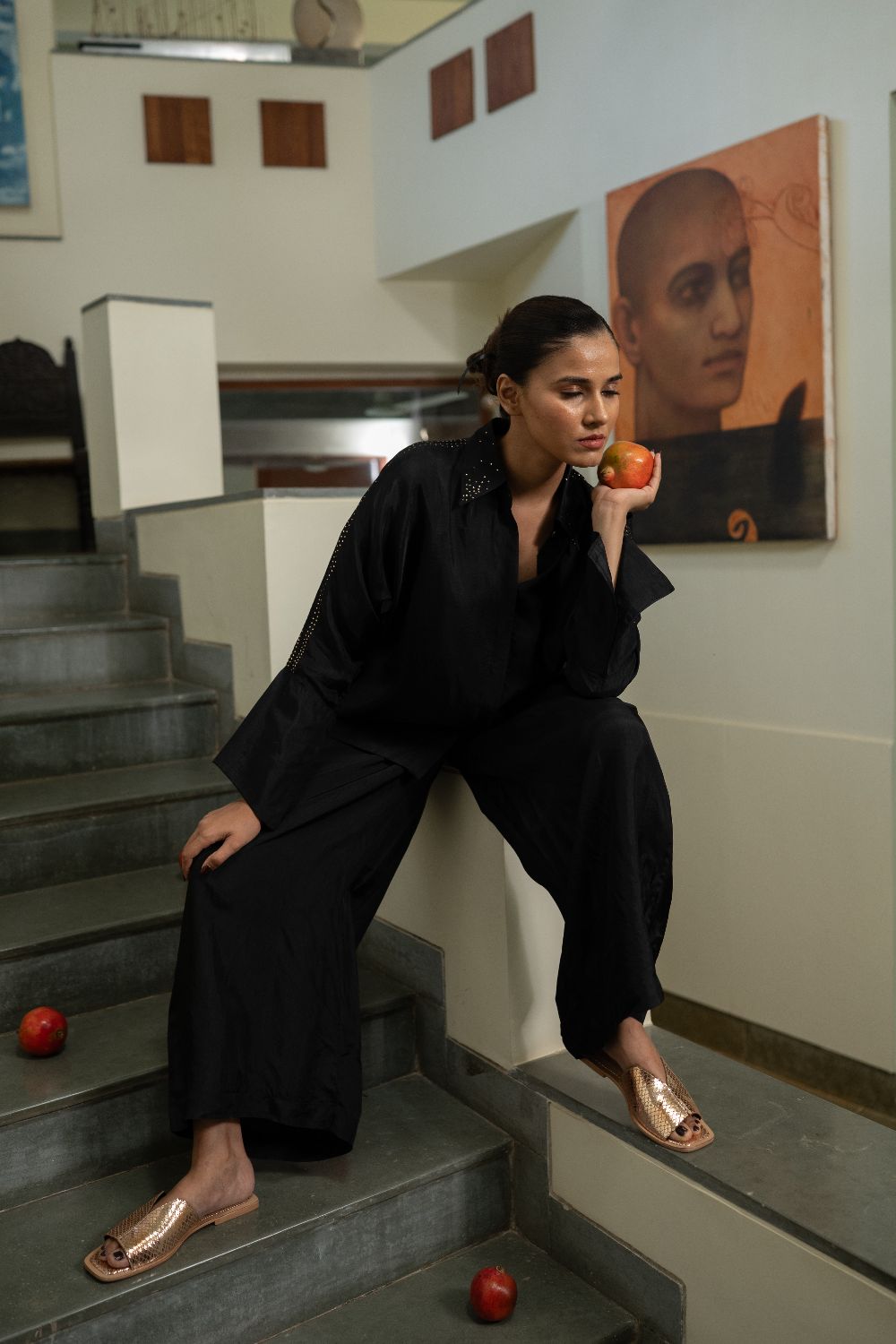 The relaxed-fit top features badla details along the collar, sleeves, and pockets, small glimmers that catch the light subtly. The matching straight-leg trousers bring balance, creating a set that’s as effortless as it is refined.