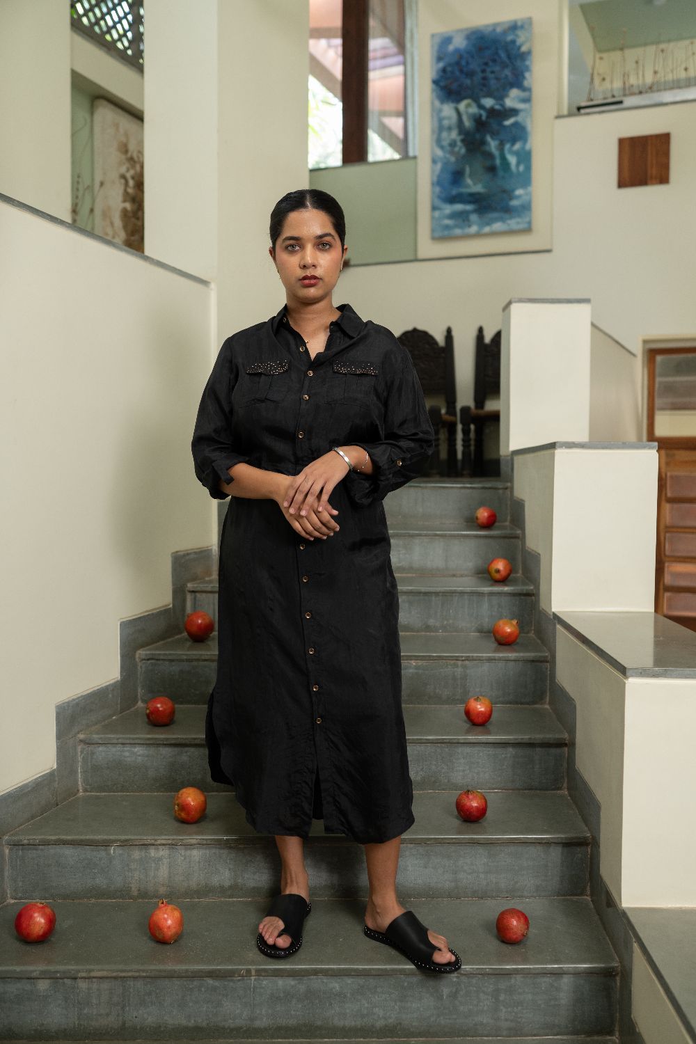A shirt dress that flows like liquid, catching the light with every turn. Detailed with delicate badla embroidery along the collar, pockets, and sleeves, it’s effortless yet statement-making. Wear it as a dress, belt it for structure, or layer it over trousers as an open cape.