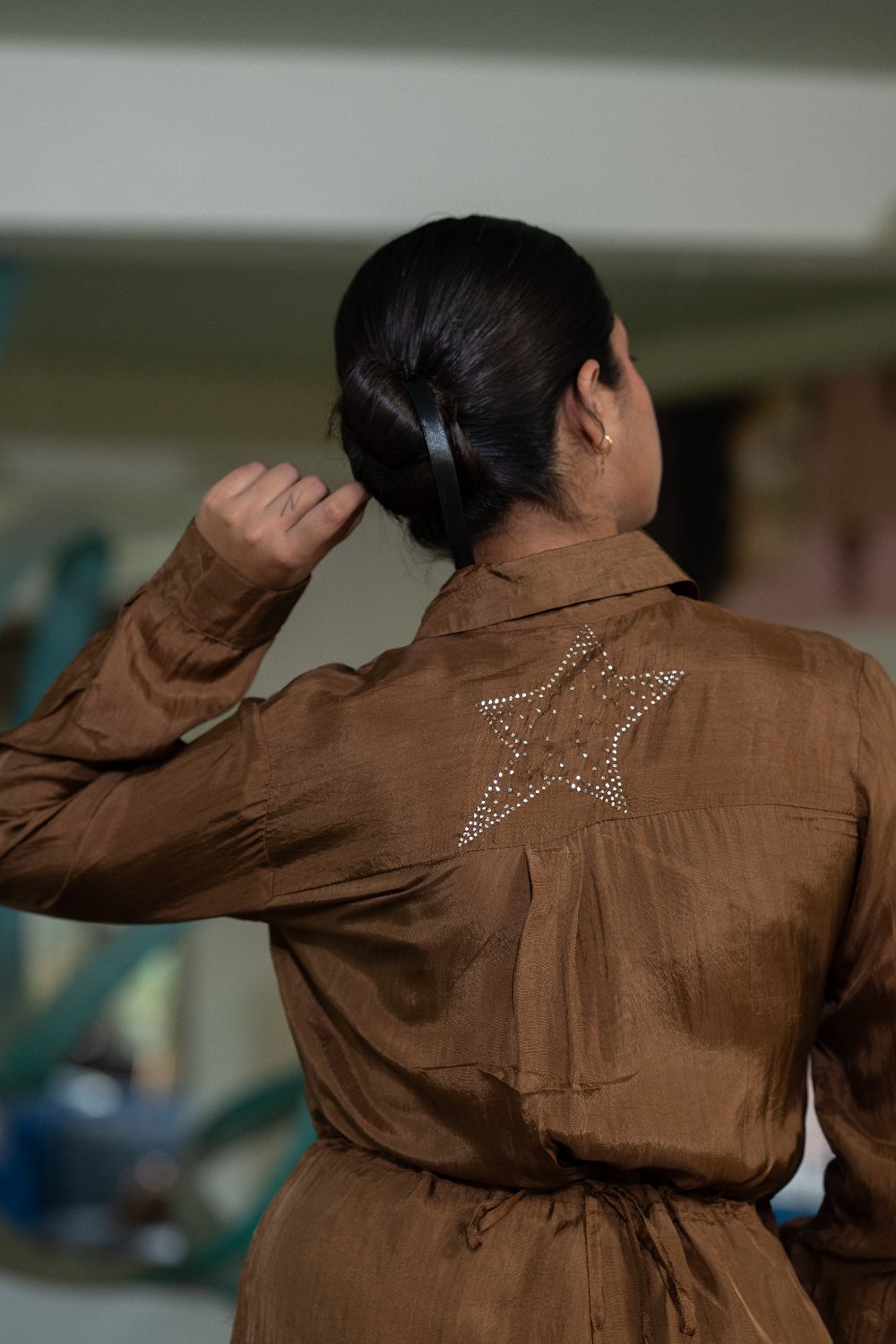 A shirt dress that flows like liquid, catching the light with every turn. Detailed with delicate badla embroidery along the collar, pockets, and sleeves, it’s effortless yet statement-making. Wear it as a dress, belt it for structure, or layer it over trousers as an open cape.