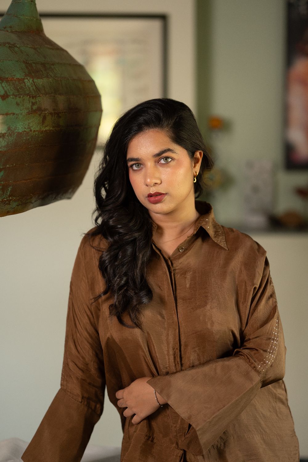 The relaxed-fit top features badla details along the collar, sleeves, and pockets, small glimmers that catch the light subtly. The matching straight-leg trousers bring balance, creating a set that’s as effortless as it is refined.