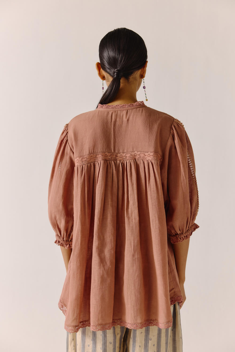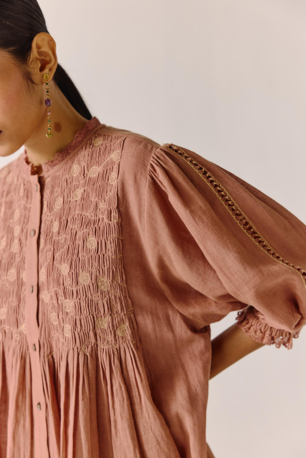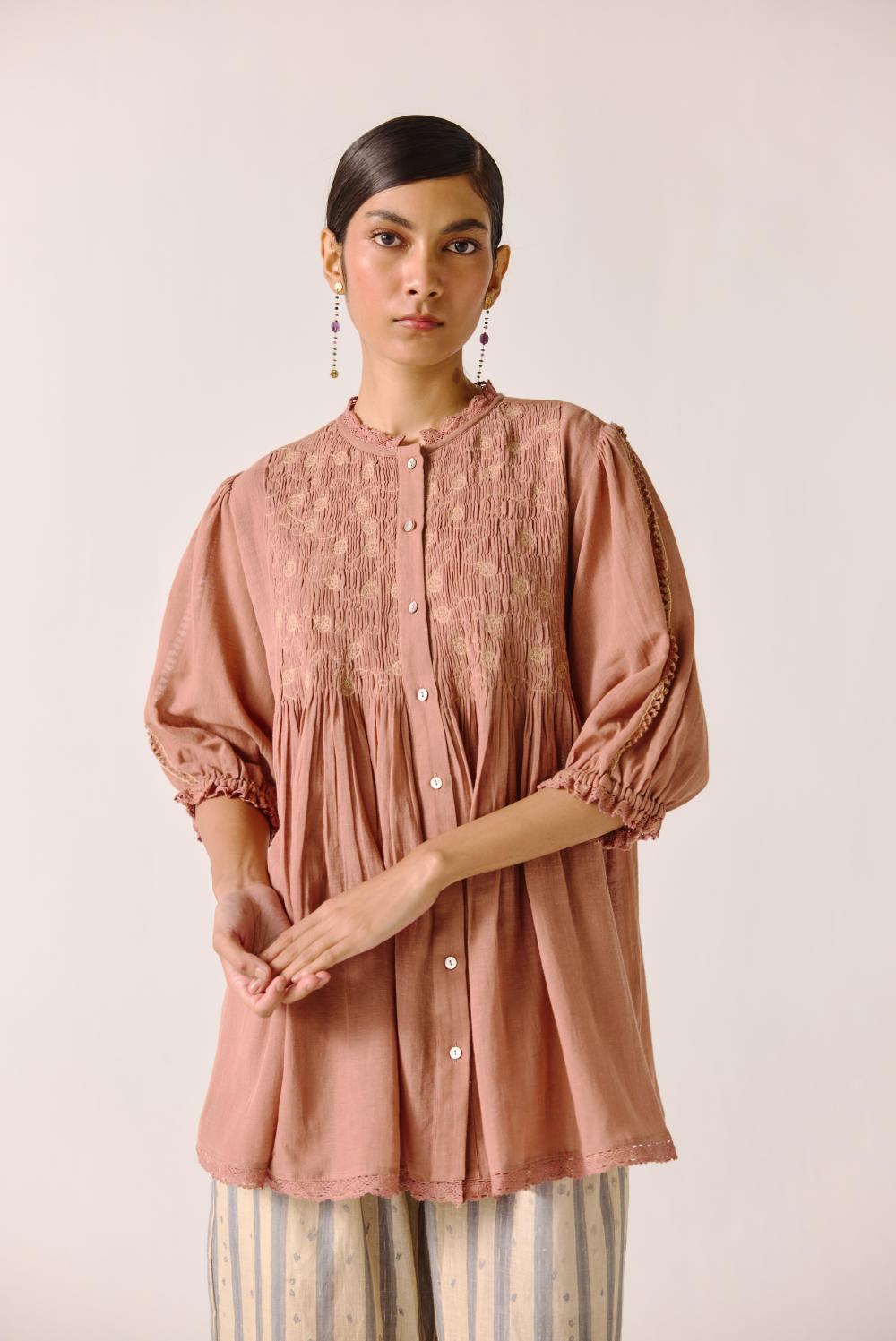 The Nova top is made from cotton in our Peach anaar embroidery, a button-down top. It features scallop lace detail on the neck, cuff and hem.