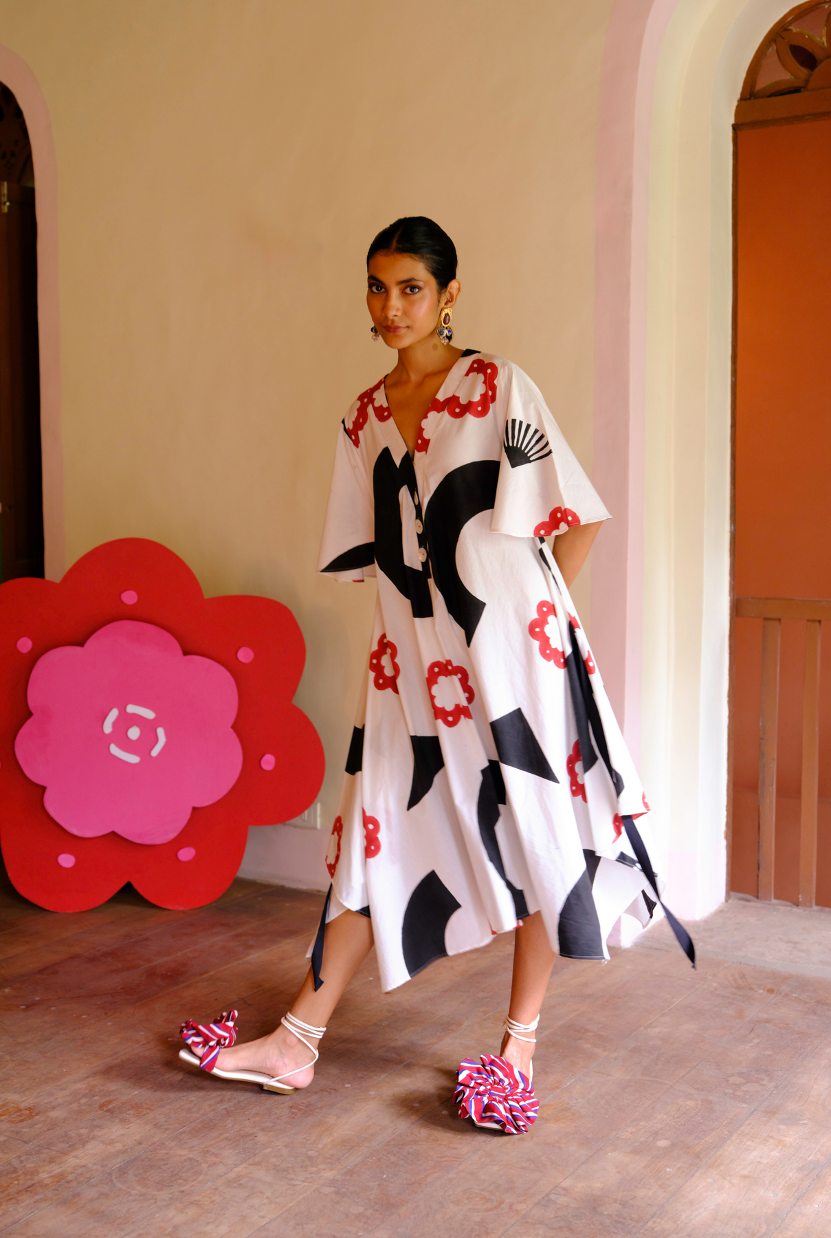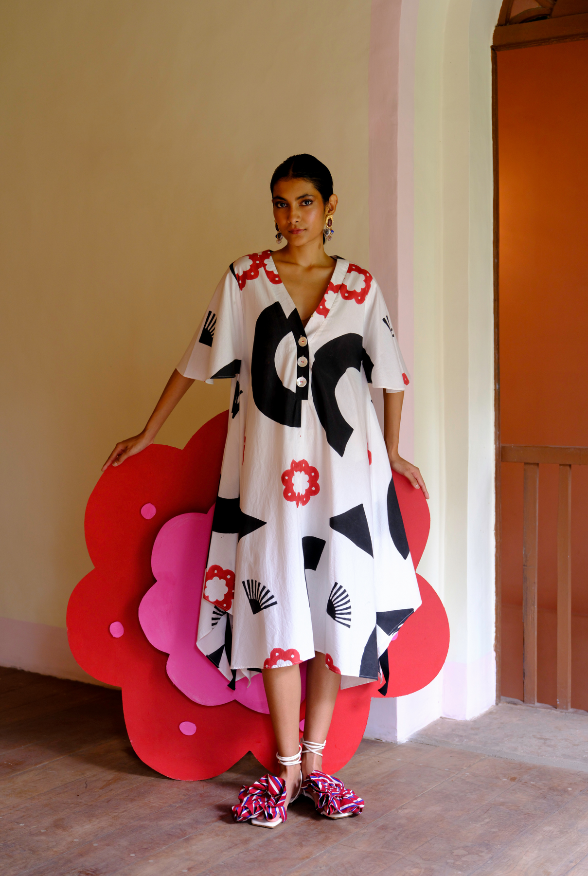 A roomy, oversized fit and a graphic hand-block printed that screams ‘I woke up looking this cool’. Don’t miss the black trim details floating along the edges of the dress.